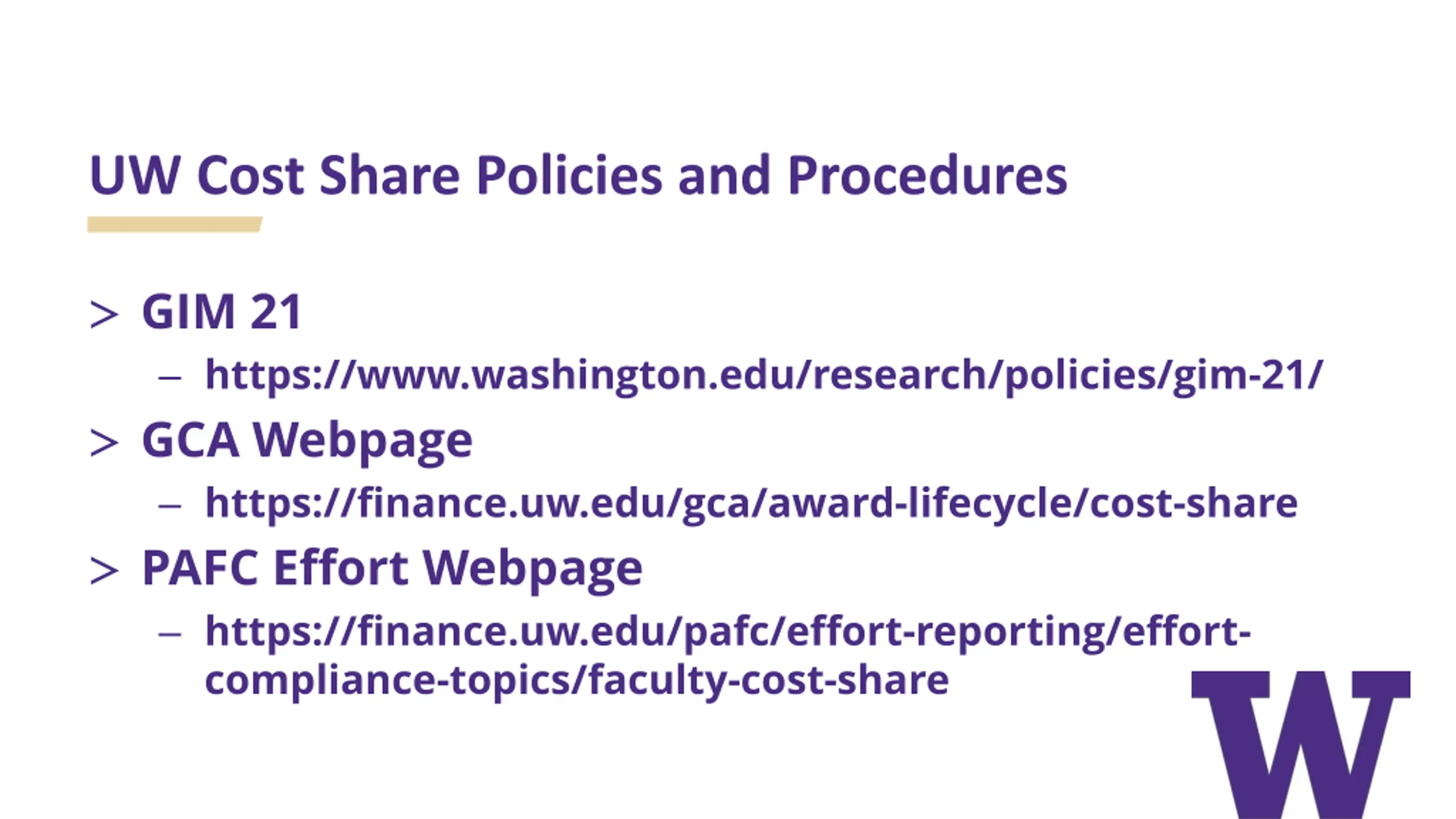 UW Cost Share Policies and Procedures > GIM 21 https://www.washington.edu/research/policies/gim-21/ > GCA Webpage https://finance.uw.edu/gca/award-lifecycle/cost-share > PAFC Effort Webpage https://finance.uw.edu/pafc/effort-reporting/effort- compliance-topics/faculty-cost-share
