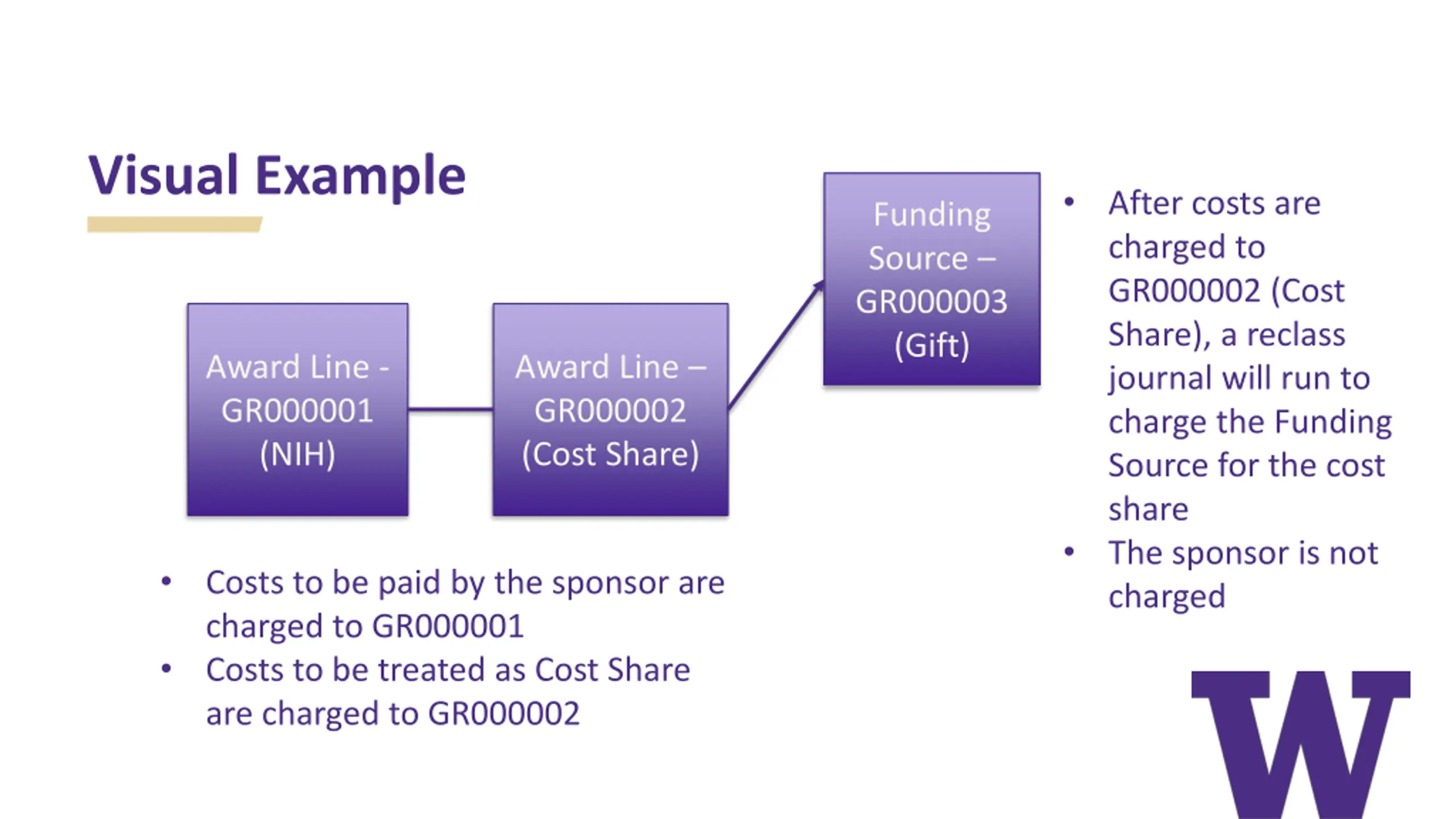 Visual Example After costs are charged to GR000002 (Cost Share), a reclass journal will run to charge the Funding Source for the cost share The sponsor is not charged Funding Source GR000003 (Gift) Award Line - GR000001 (NIH) Award Line GR000002 (Cost Share) Costs to be paid by the sponsor are charged to GR000001 Costs to be treated as Cost Share are charged to GR000002