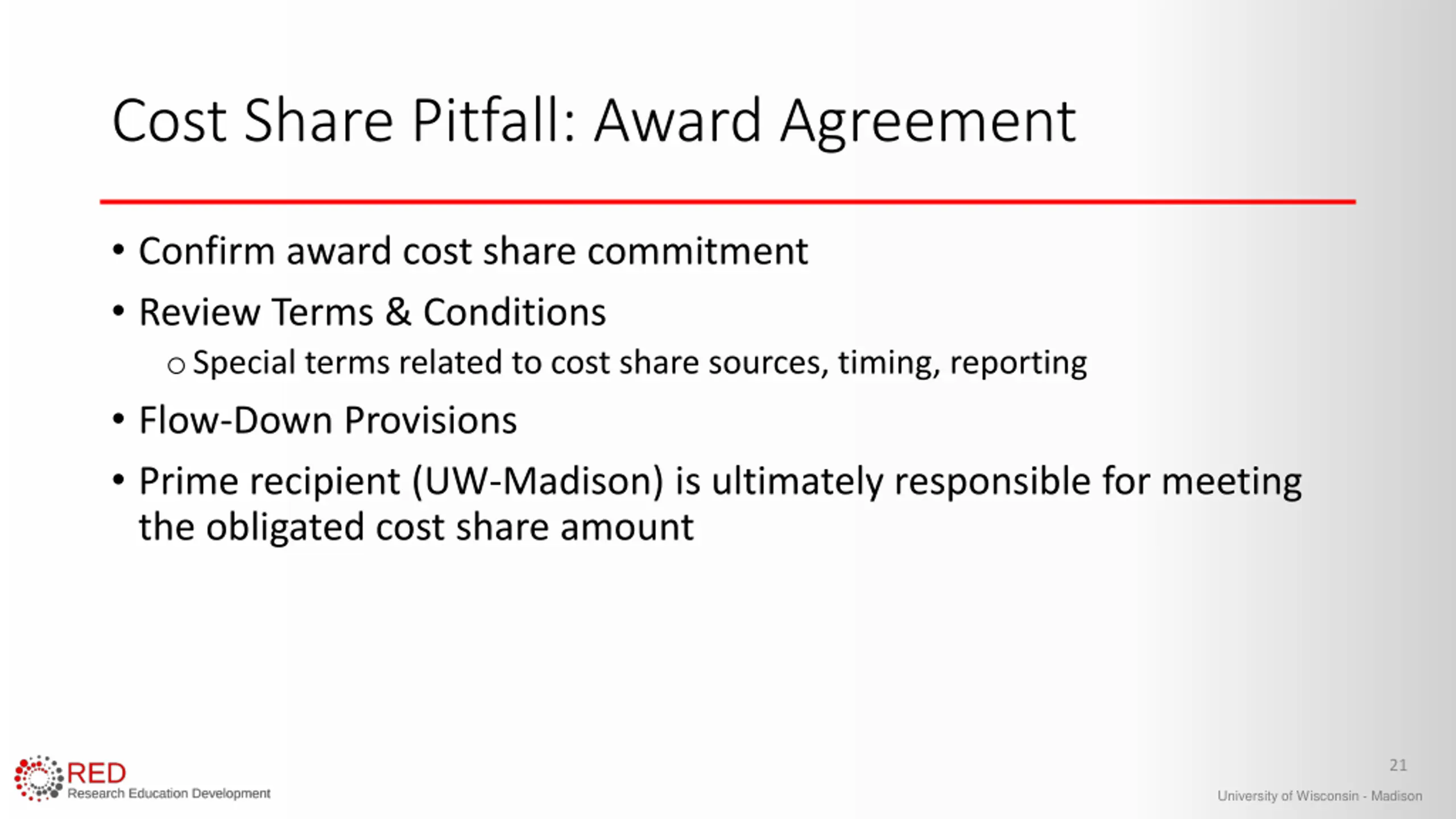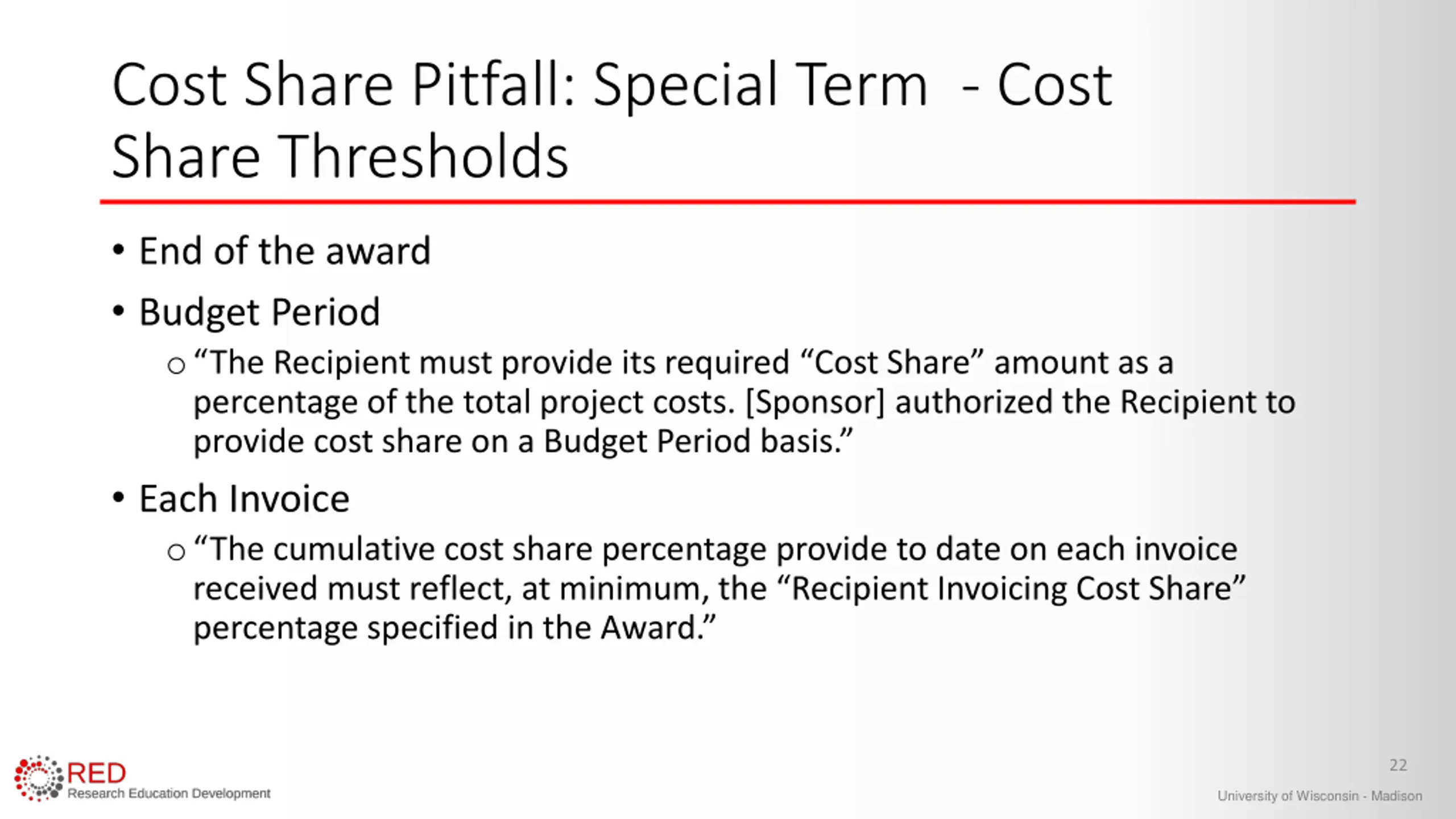 Cost Share Pitfall: Award Agreement Confirm award cost share commitment Review Terms & Conditions oSpecial terms related to cost share sources, timing, reporting Flow-Down Provisions Prime recipient (UW-Madison) is ultimately responsible for meeting the obligated cost share amount 21 University of Wisconsin - Madison