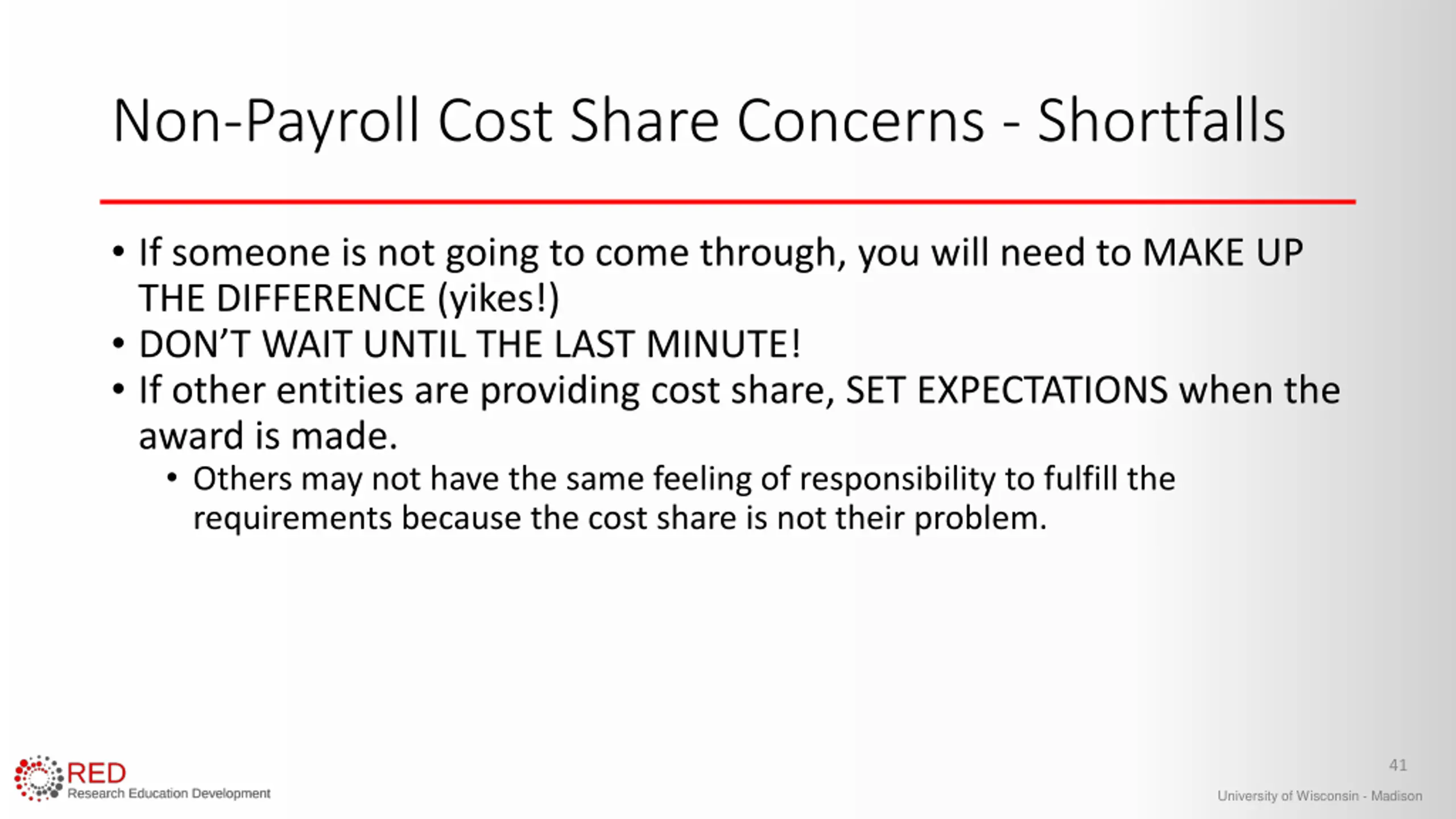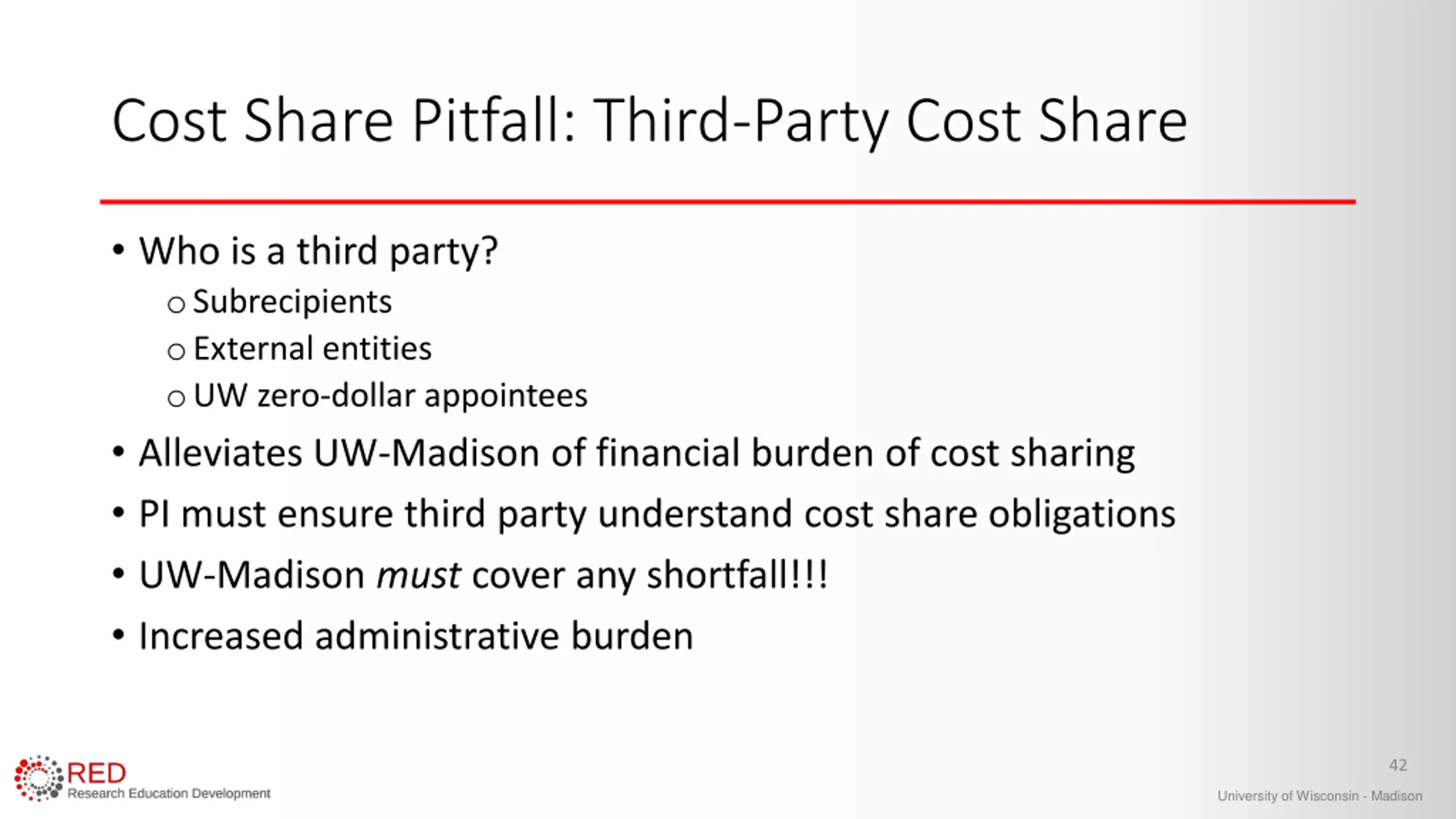 Non-Payroll Cost Share Concerns - Shortfalls If someone is not going to come through, you will need to MAKE UP THE DIFFERENCE (yikes!) DON T WAIT UNTIL THE LAST MINUTE! If other entities are providing cost share, SET EXPECTATIONS when the award is made. Others may not have the same feeling of responsibility to fulfill the requirements because the cost share is not their problem. 41 University of Wisconsin - Madison