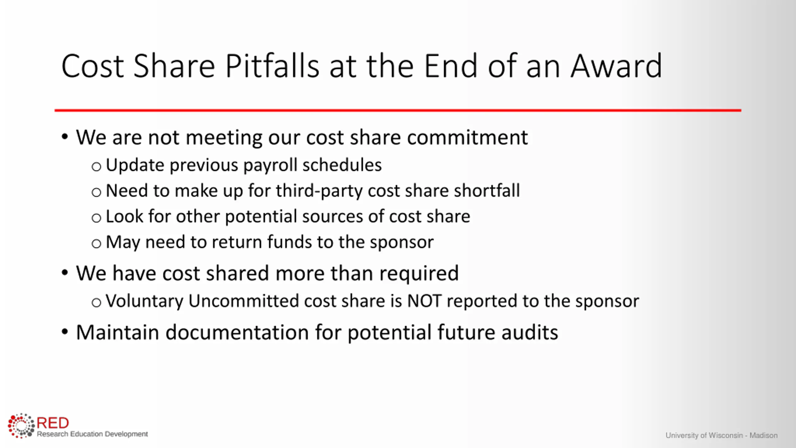 Cost Share Pitfalls at the End of an Award We are not meeting our cost share commitment oUpdate previous payroll schedules oNeed to make up for third-party cost share shortfall oLook for other potential sources of cost share oMay need to return funds to the sponsor We have cost shared more than required oVoluntary Uncommitted cost share is NOT reported to the sponsor Maintain documentation for potential future audits University of Wisconsin - Madison