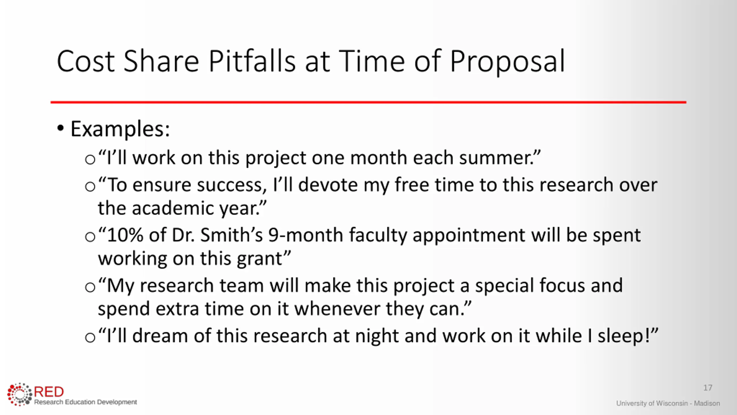 Cost Share Pitfalls at Time of Proposal Don t Cost Share if it s Not Mandatory! Do not offer or let your PIs offer quantified voluntary cost share! 16 University of Wisconsin - Madison