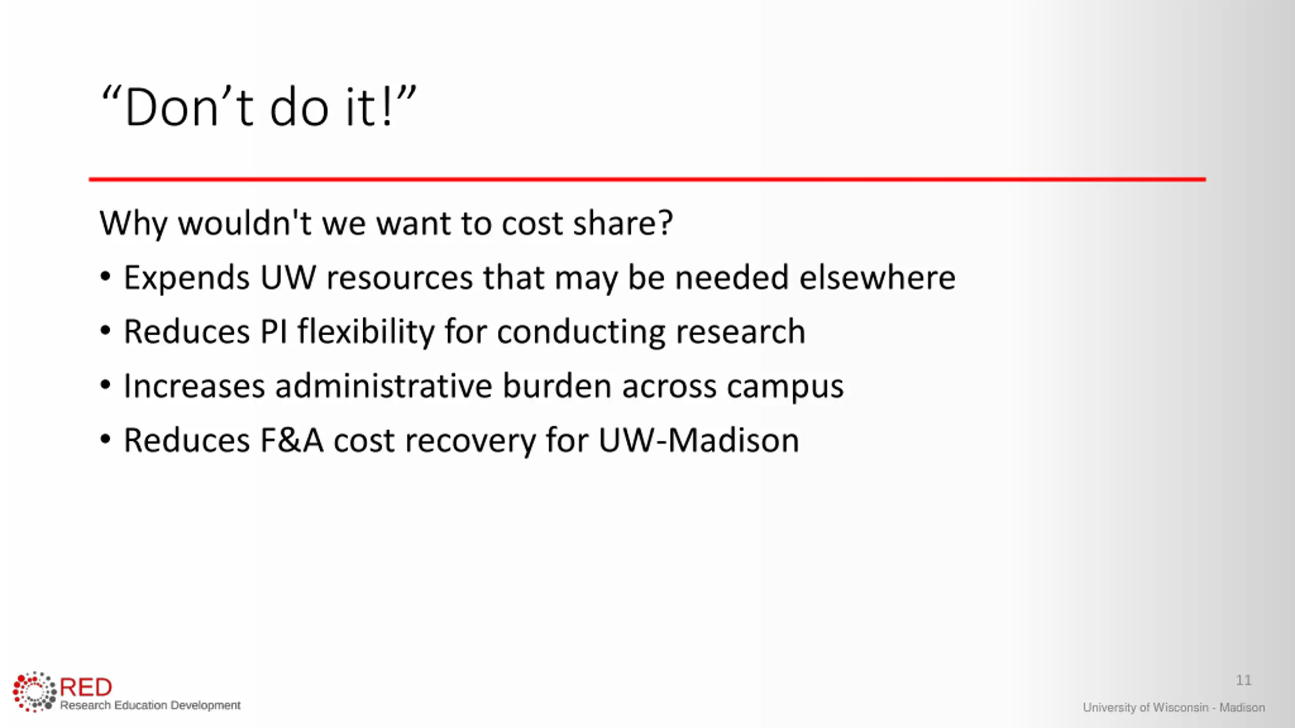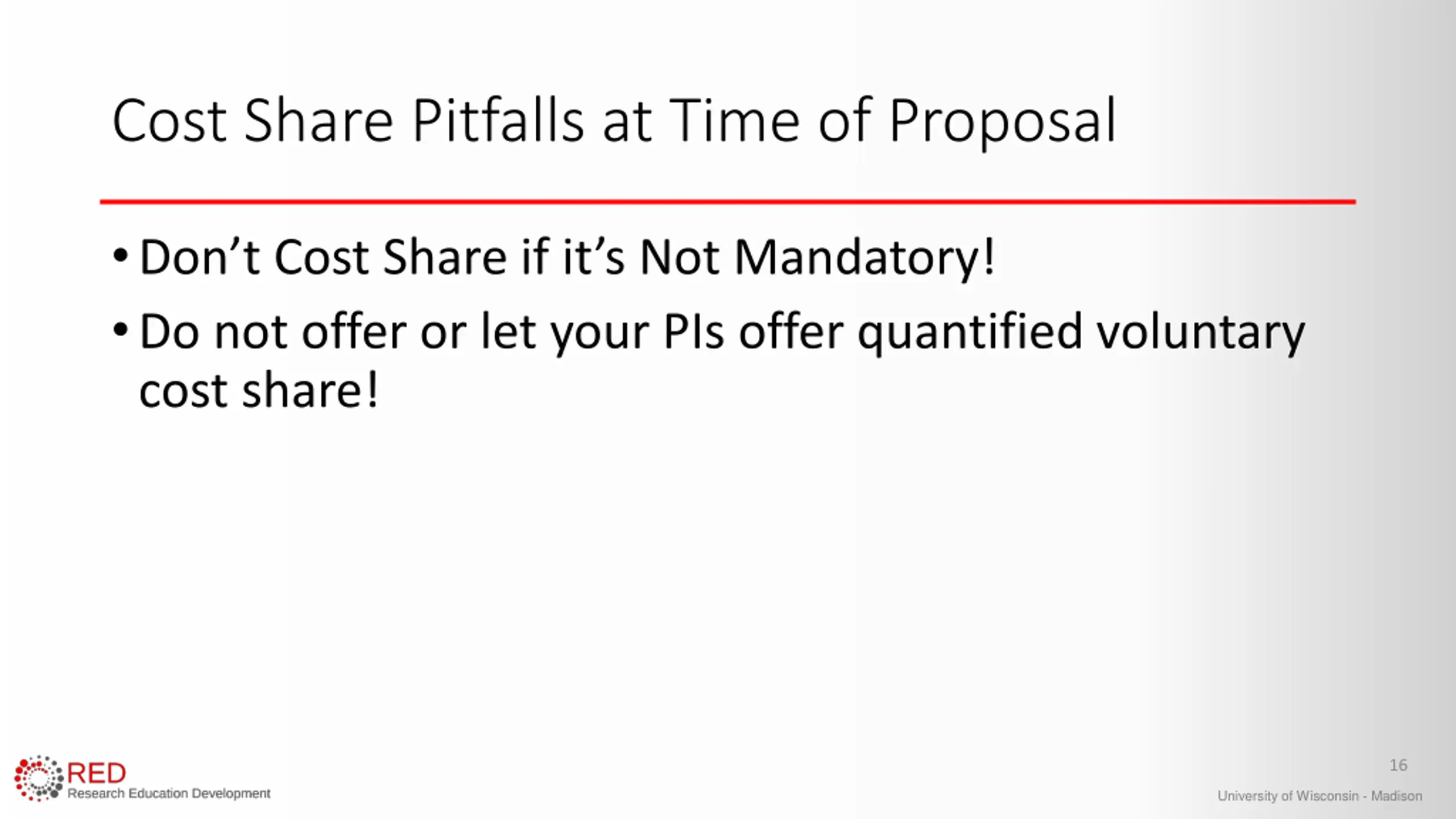 Dont do it! Why wouldn't we want to cost share? Expends UW resources that may be needed elsewhere Reduces PI flexibility for conducting research Increases administrative burden across campus Reduces F&A cost recovery for UW-Madison 11 University of Wisconsin - Madison