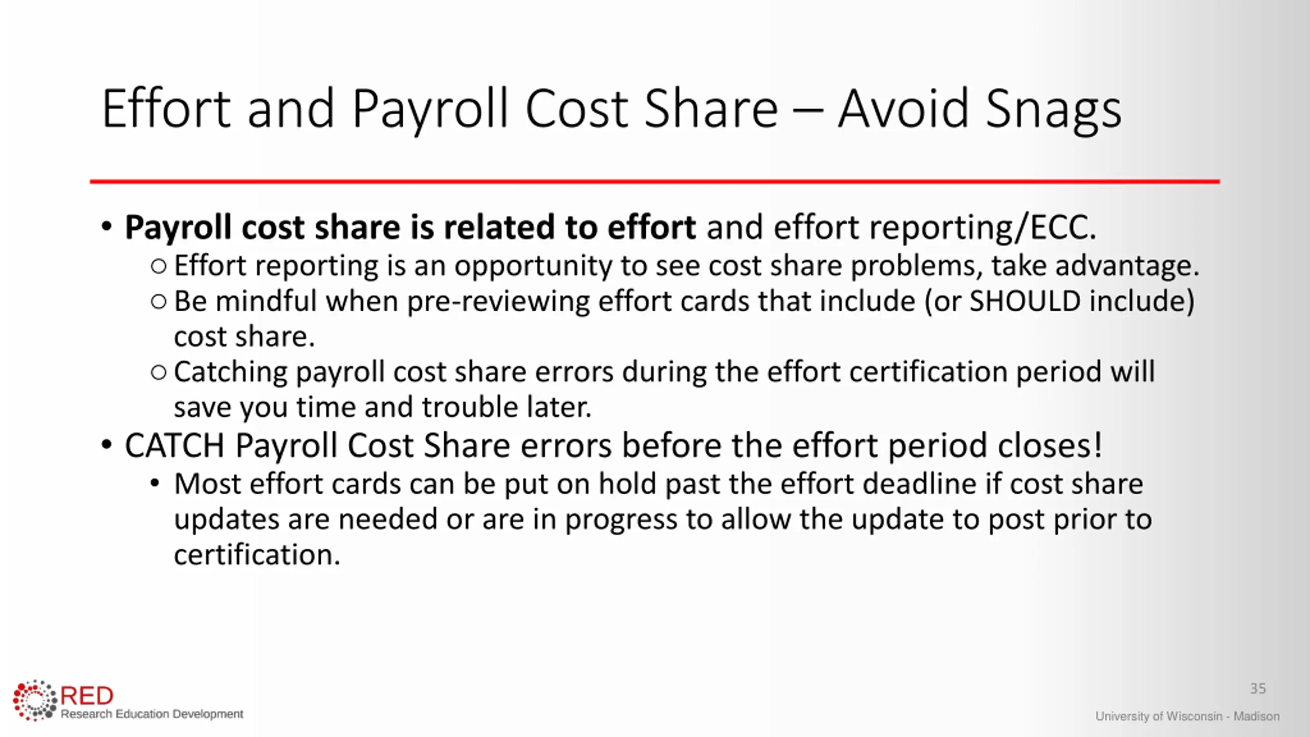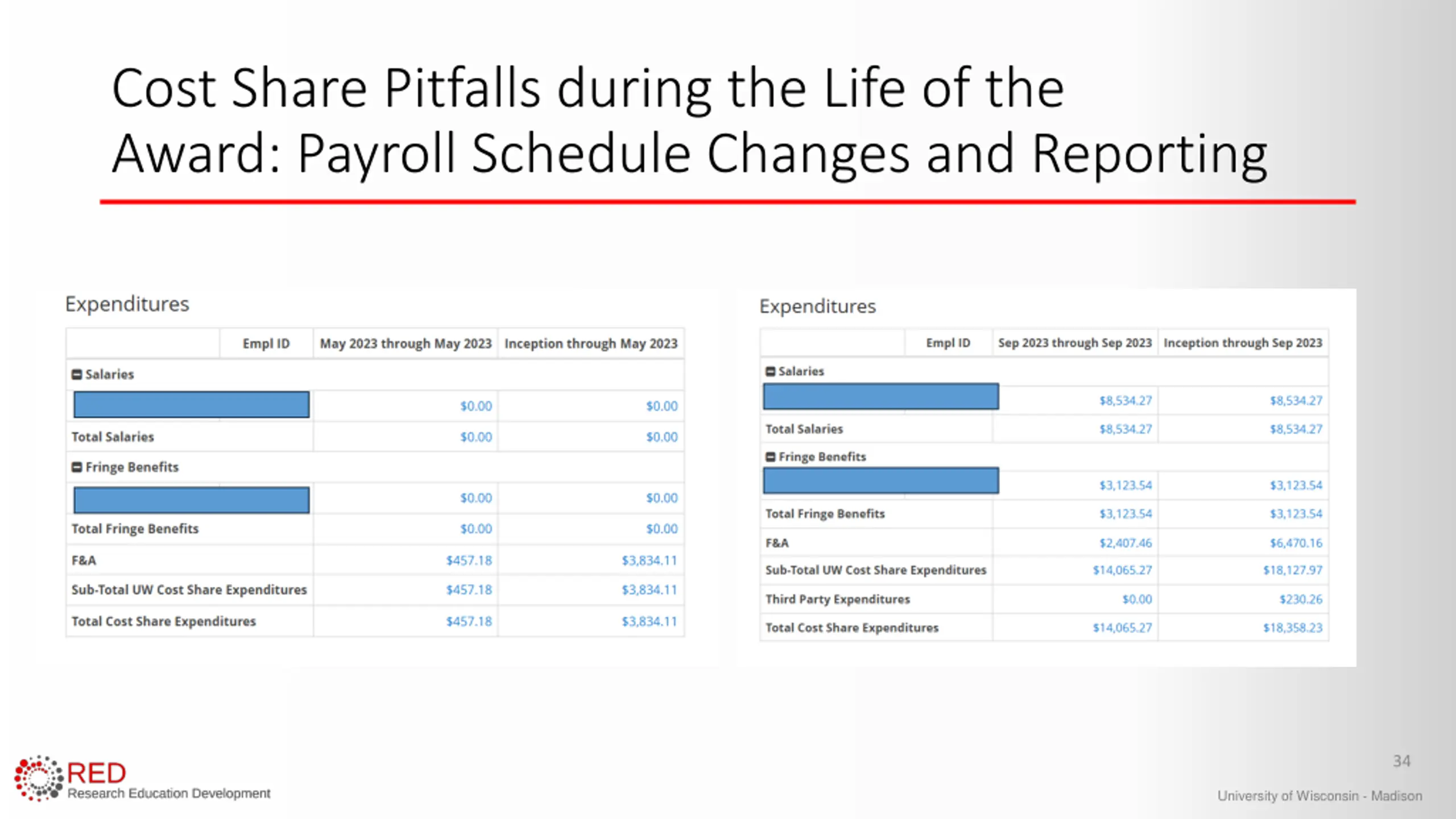 Cost Share Pitfalls during the Life of the Award: Payroll Schedule Changes and Reporting 34 University of Wisconsin - Madison