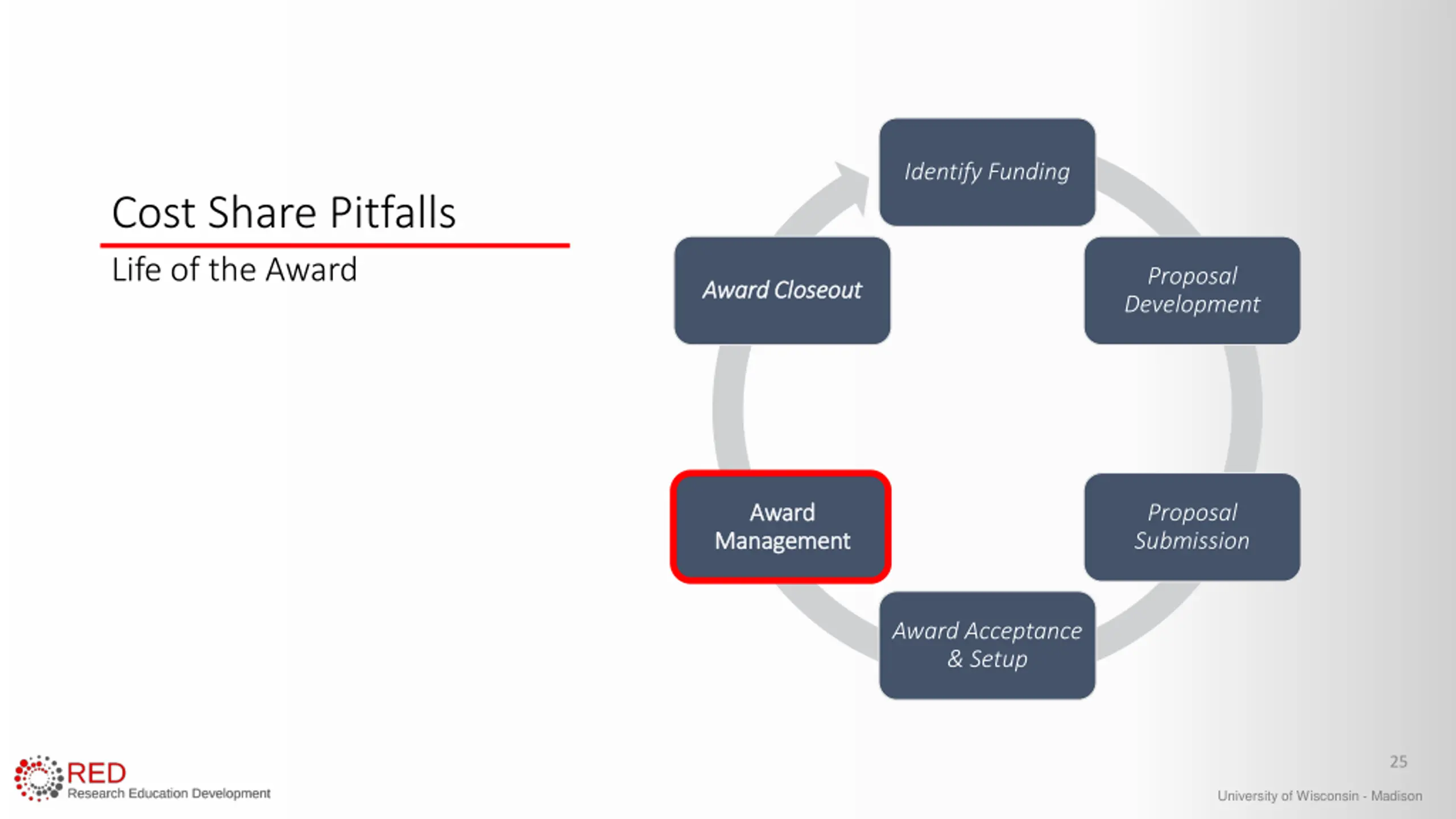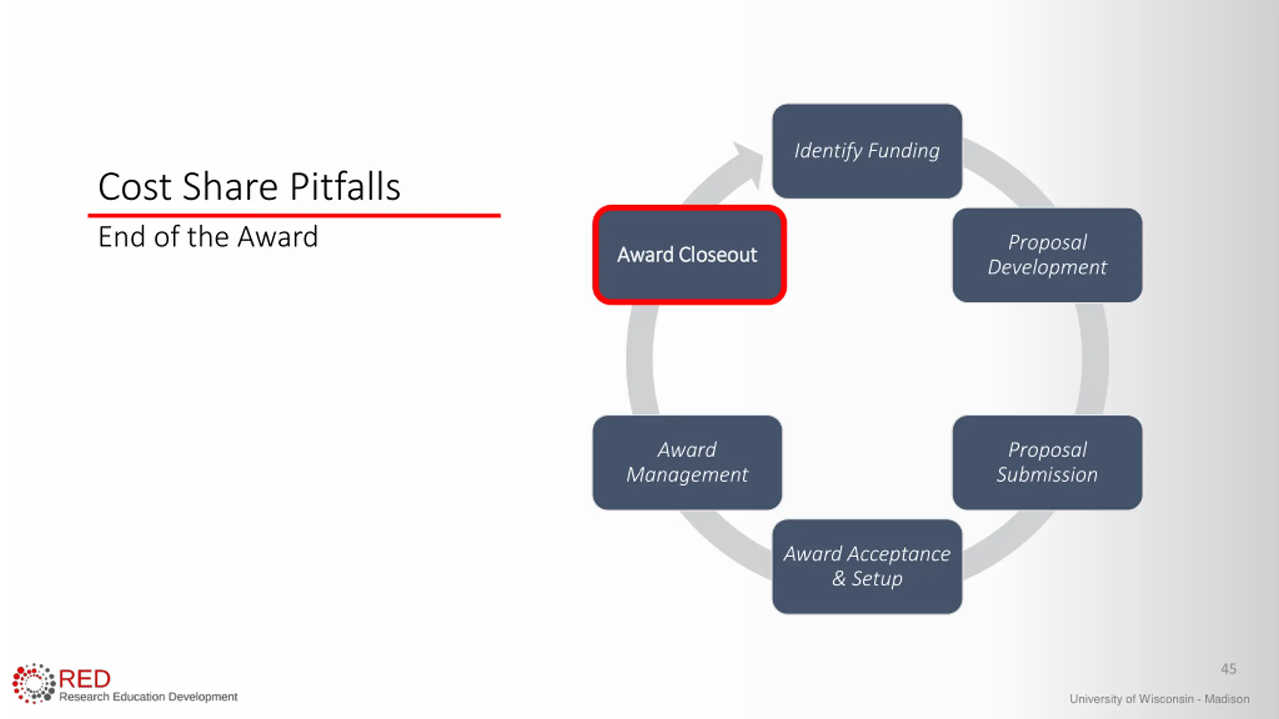 Identify Funding Identify Funding Cost Share Pitfalls Time of Proposal Proposal Proposal Development Development Award Closeout Award Proposal Proposal Submission Submission Management Award Acceptance & Setup University of Wisconsin - Madison
