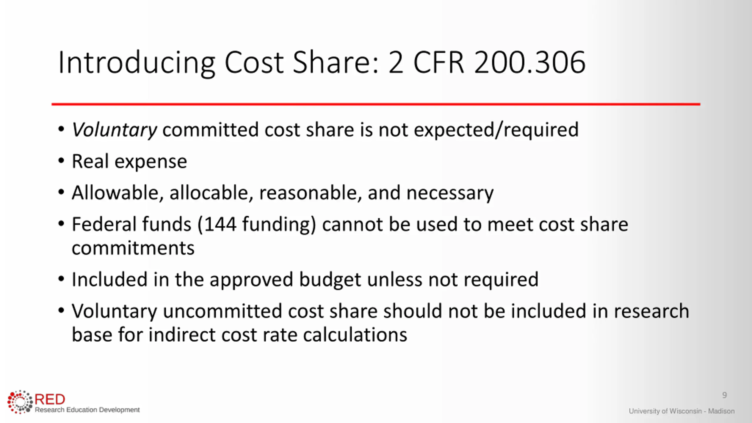 Introducing Cost Share: 2 CFR 200.306 Voluntary committed cost share is not expected/required Real expense Allowable, allocable, reasonable, and necessary Federal funds (144 funding) cannot be used to meet cost share commitments Included in the approved budget unless not required Voluntary uncommitted cost share should not be included in research base for indirect cost rate calculations 9 University of Wisconsin - Madison