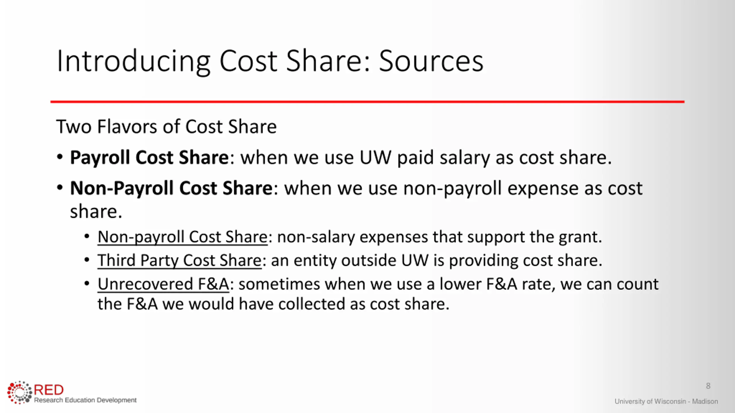 Introducing Cost Share: Types Three Types of Cost Share Mandatory: the sponsor requires it as a condition of accepting the funding. Voluntary, Committed: when we offer quantified cost share in our proposal documents or budget. Must be tracked and documented. Voluntary, Uncommitted: when we offer unquantified cost share in our proposal documents. NOT tracked. 7 University of Wisconsin - Madison