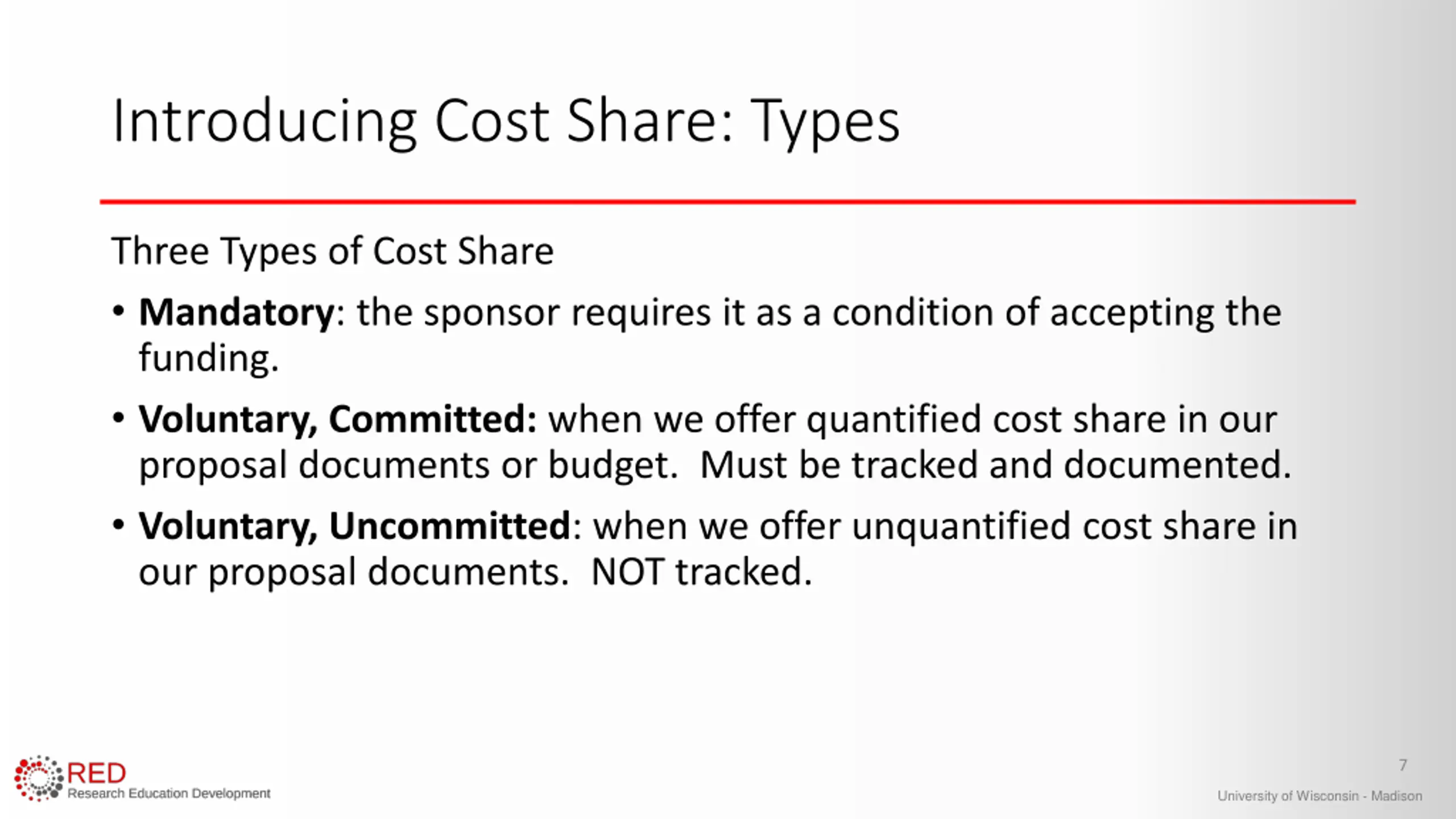 Introducing Cost Share Cost Share is when we share the cost of research on a grant by using UW funds to pay for a portion of the project cost. Cost shared expenses must be paid from UW non-sponsored funds We must document cost share for our sponsors. 6 University of Wisconsin - Madison