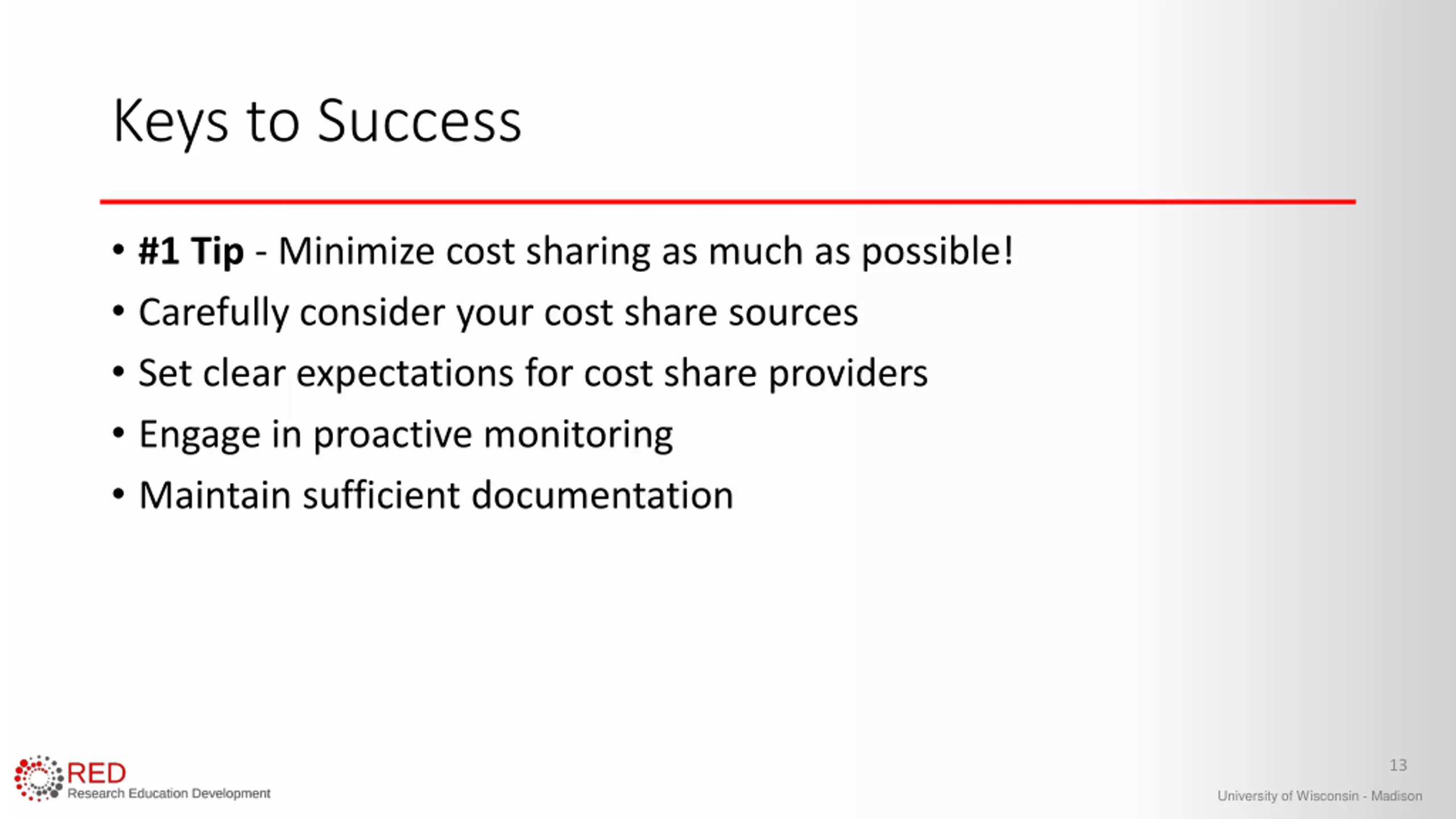 Keys to Success #1 Tip - Minimize cost sharing as much as possible! Carefully consider your cost share sources Set clear expectations for cost share providers Engage in proactive monitoring Maintain sufficient documentation 13 University of Wisconsin - Madison