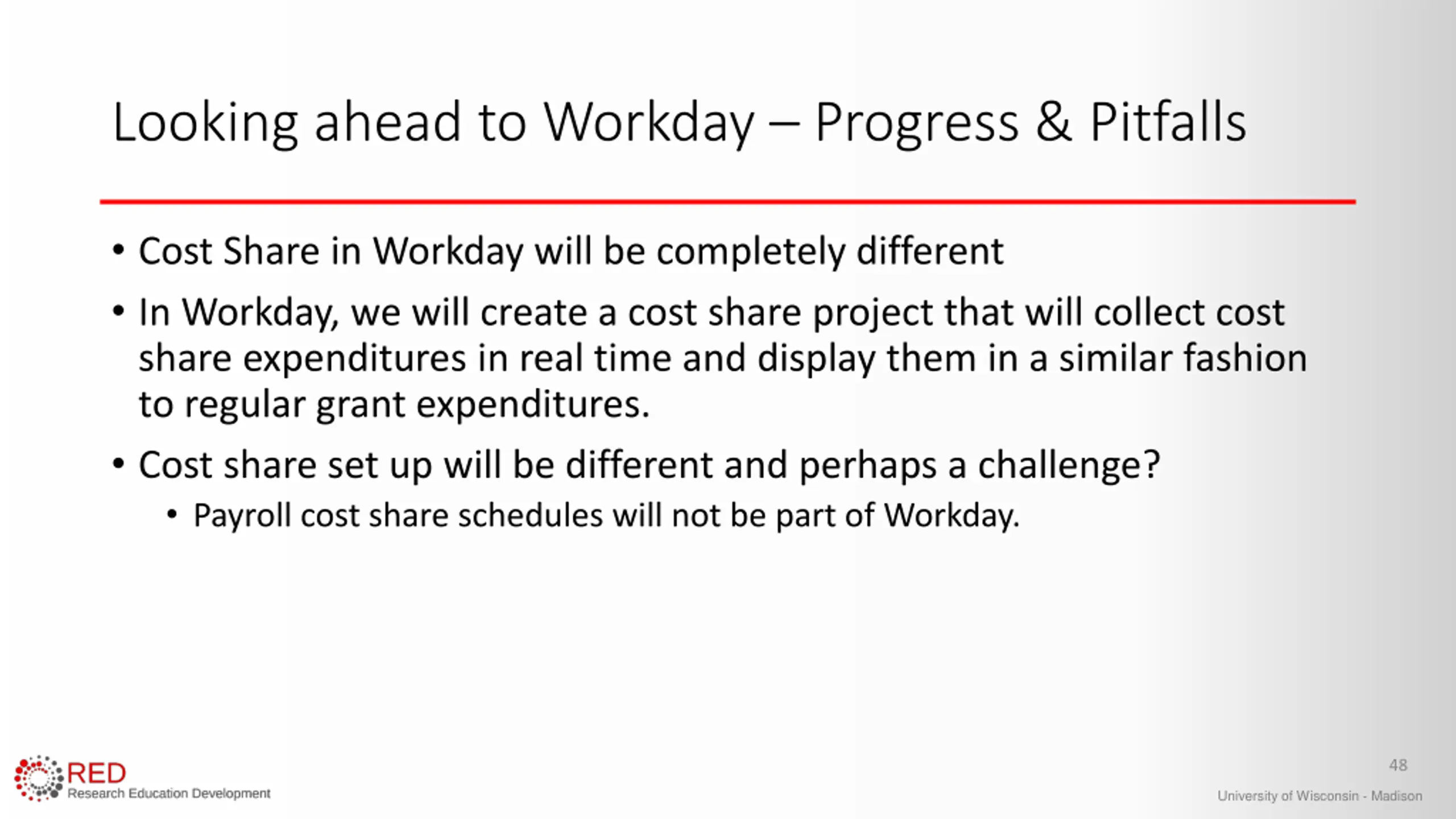 Looking ahead to Workday Progress & Pitfalls Cost Share in Workday will be completely different In Workday, we will create a cost share project that will collect cost share expenditures in real time and display them in a similar fashion to regular grant expenditures. Cost share set up will be different and perhaps a challenge? Payroll cost share schedules will not be part of Workday. 48 University of Wisconsin - Madison