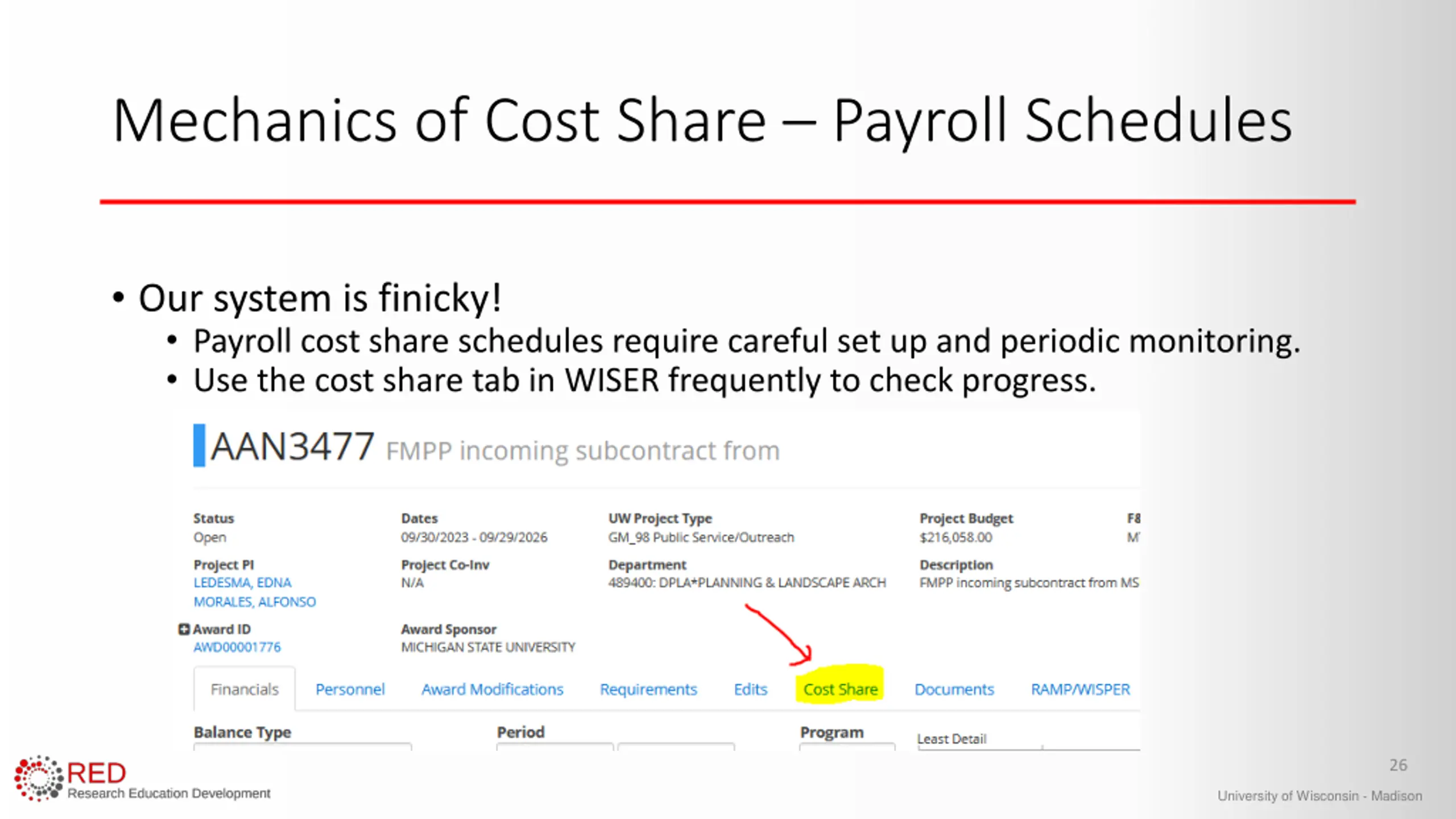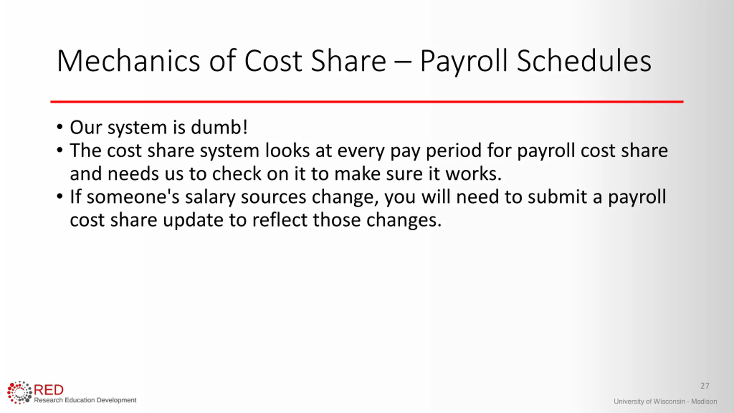 Mechanics of Cost Share Payroll Schedules Our system is dumb! The cost share system looks at every pay period for payroll cost share and needs us to check on it to make sure it works. If someone's salary sources change, you will need to submit a payroll cost share update to reflect those changes. 27 University of Wisconsin - Madison