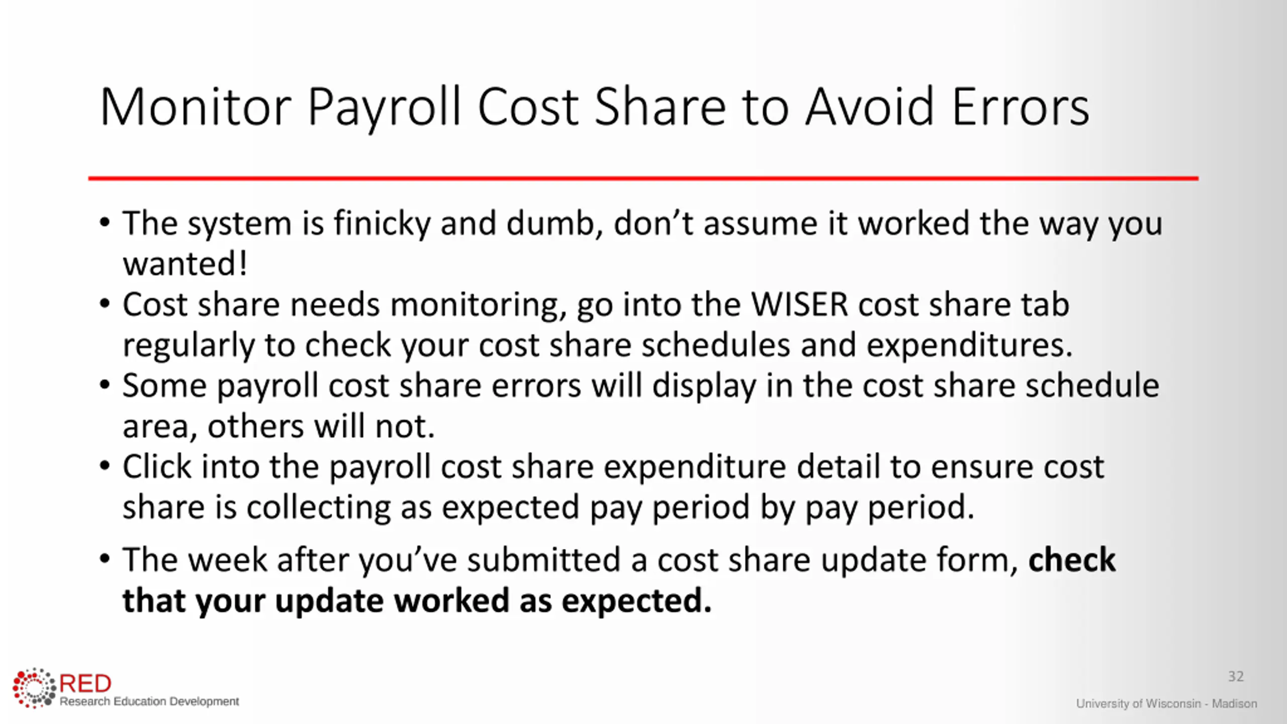 Monitor Payroll Cost Share to Avoid Errors The system is finicky and dumb, don t assume it worked the way you wanted! Cost share needs monitoring, go into the WISER cost share tab regularly to check your cost share schedules and expenditures. Some payroll cost share errors will display in the cost share schedule area, others will not. Click into the payroll cost share expenditure detail to ensure cost share is collecting as expected pay period by pay period. The week after you ve submitted a cost share update form, check that your update worked as expected. 32 University of Wisconsin - Madison