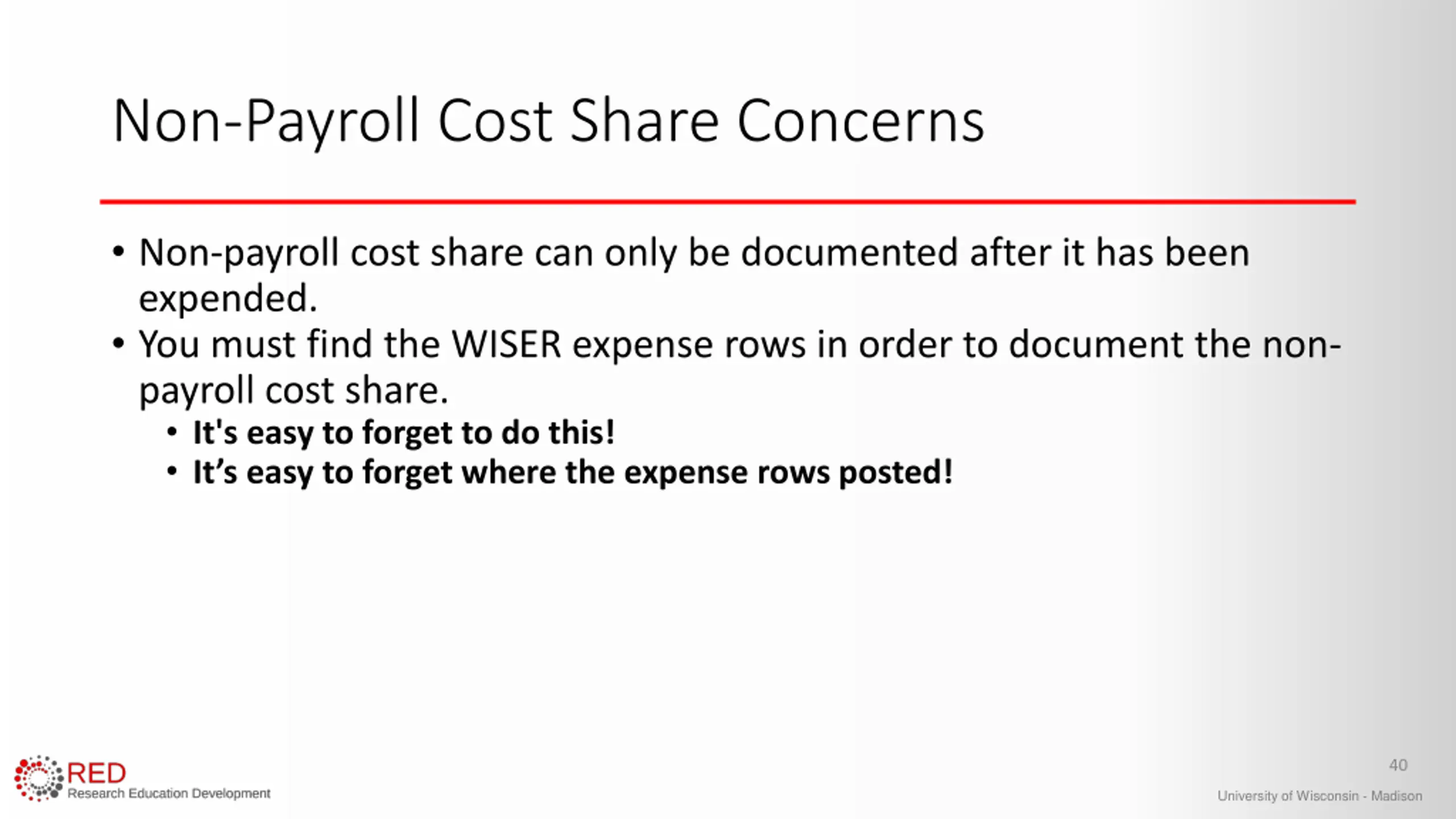 Non-Payroll Cost Share Concerns Non-payroll cost share can only be documented after it has been expended. You must find the WISER expense rows in order to document the non- payroll cost share. It's easy to forget to do this! It s easy to forget where the expense rows posted! 40 University of Wisconsin - Madison