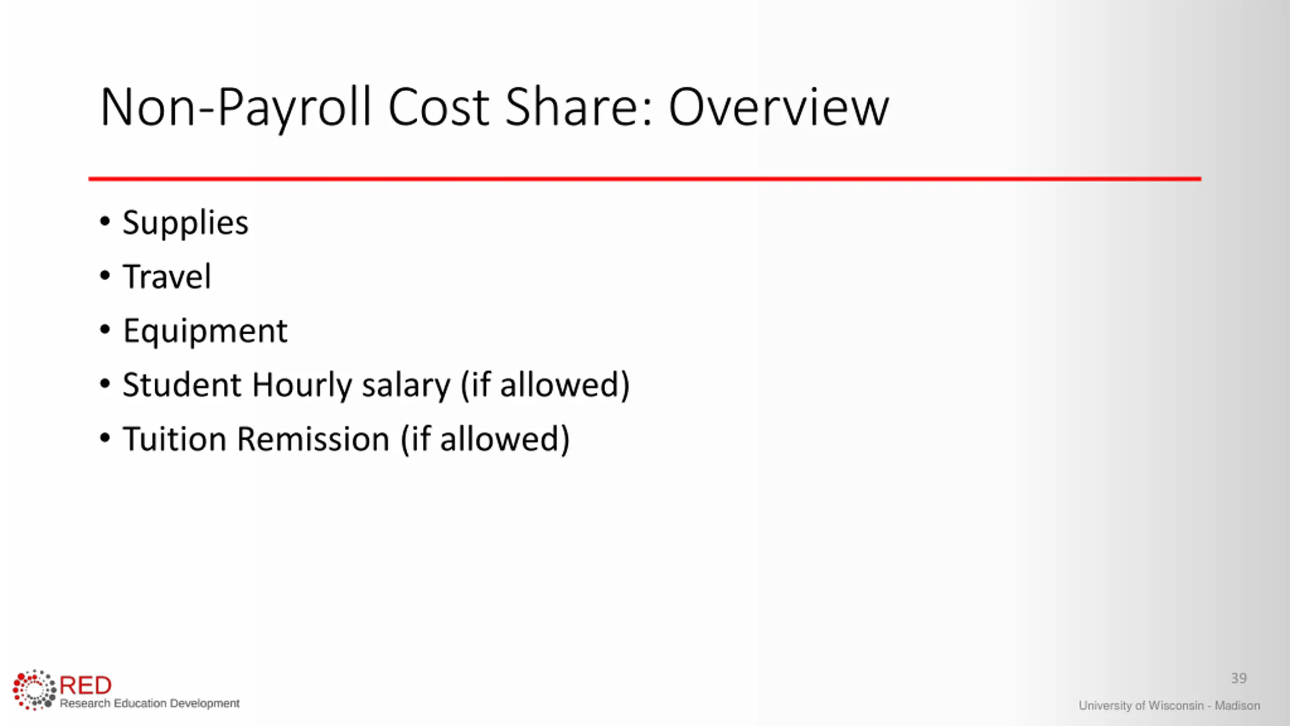 Non-Payroll Cost Share: Overview Supplies Travel Equipment Student Hourly salary (if allowed) Tuition Remission (if allowed) 39 University of Wisconsin - Madison