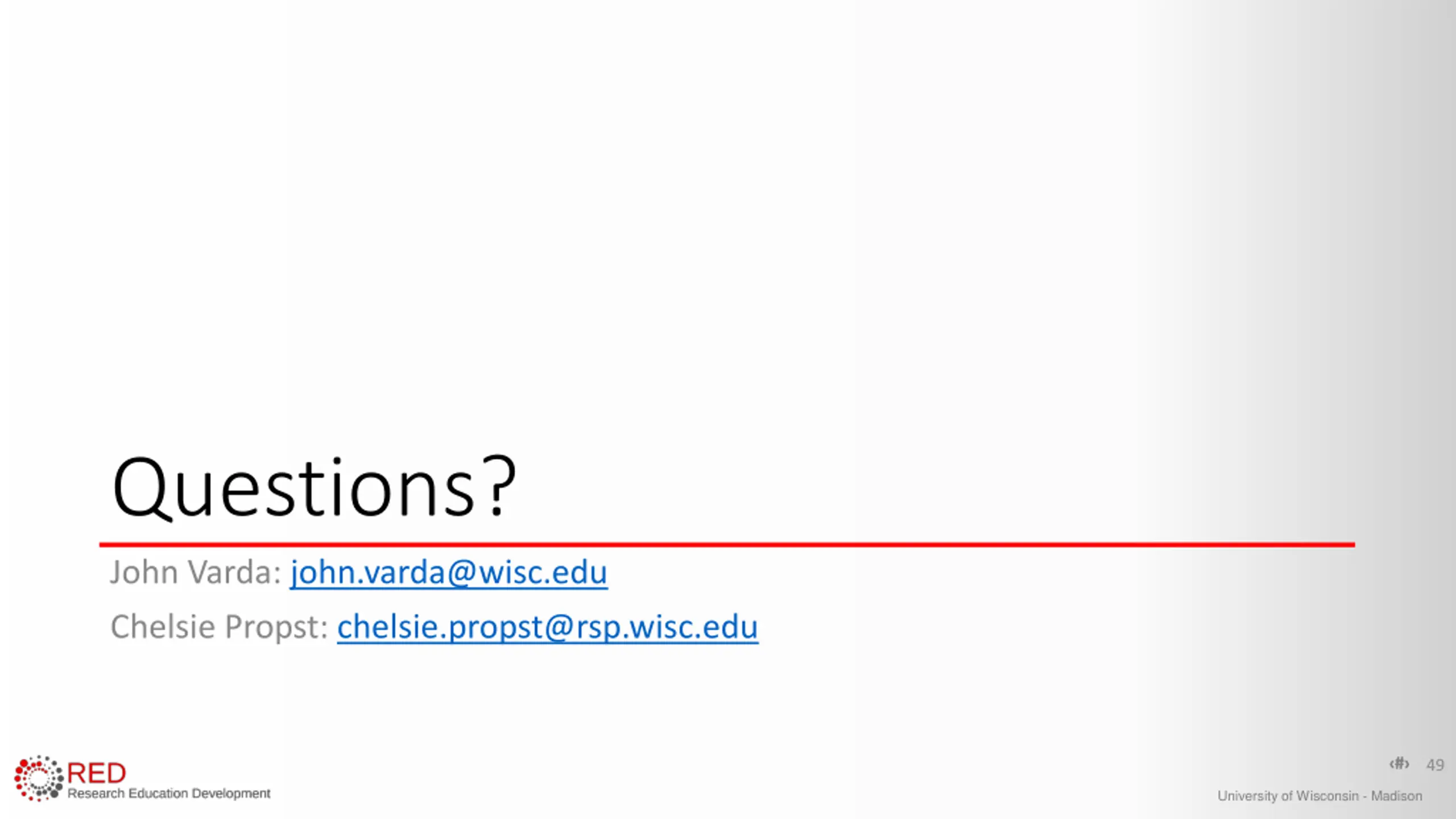 Questions? John Varda: john.varda@wisc.edu Chelsie Propst: chelsie.propst@rsp.wisc.edu 49 University of Wisconsin - Madison