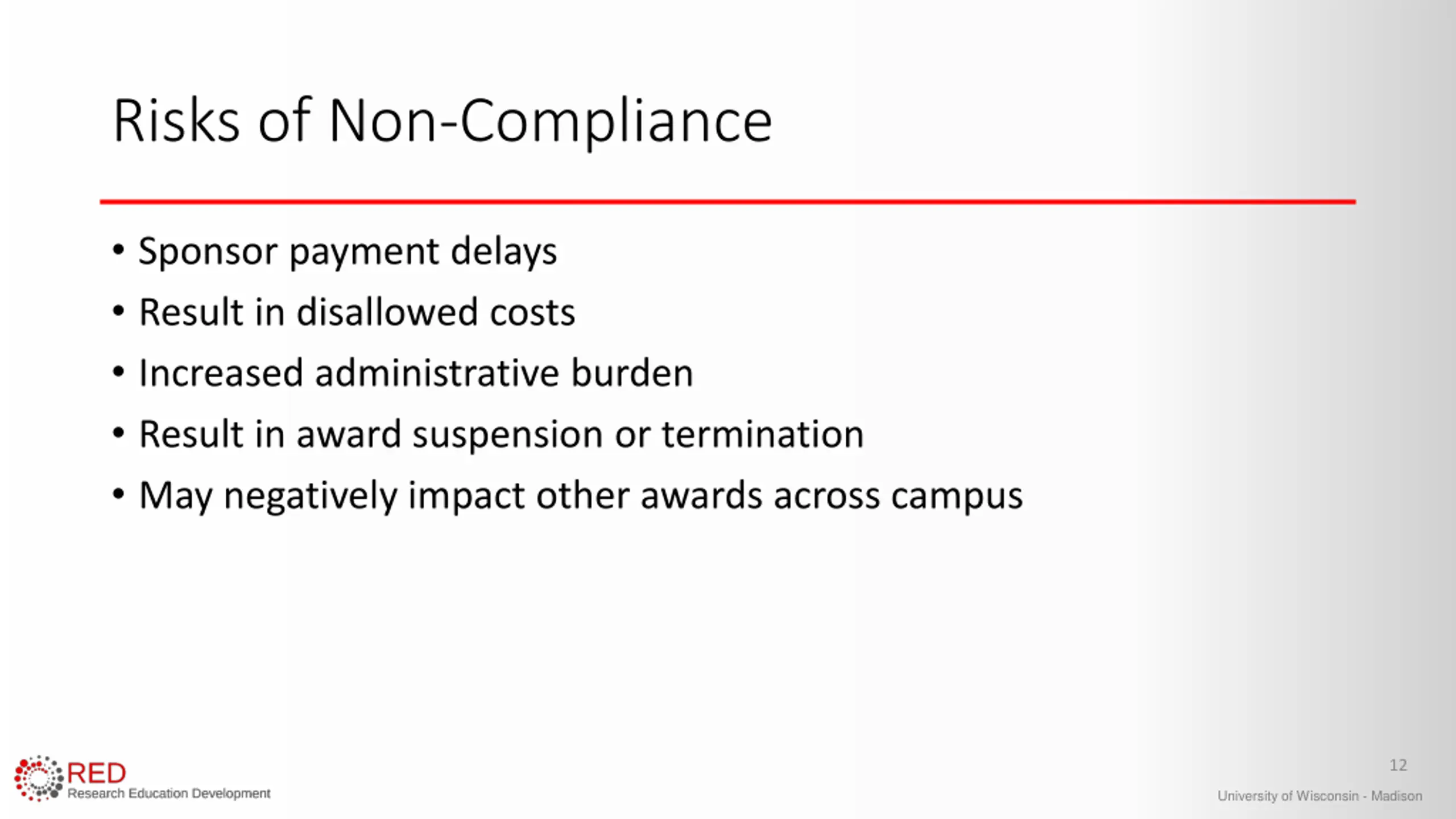 Risks of Non-Compliance Sponsor payment delays Result in disallowed costs Increased administrative burden Result in award suspension or termination May negatively impact other awards across campus 12 University of Wisconsin - Madison