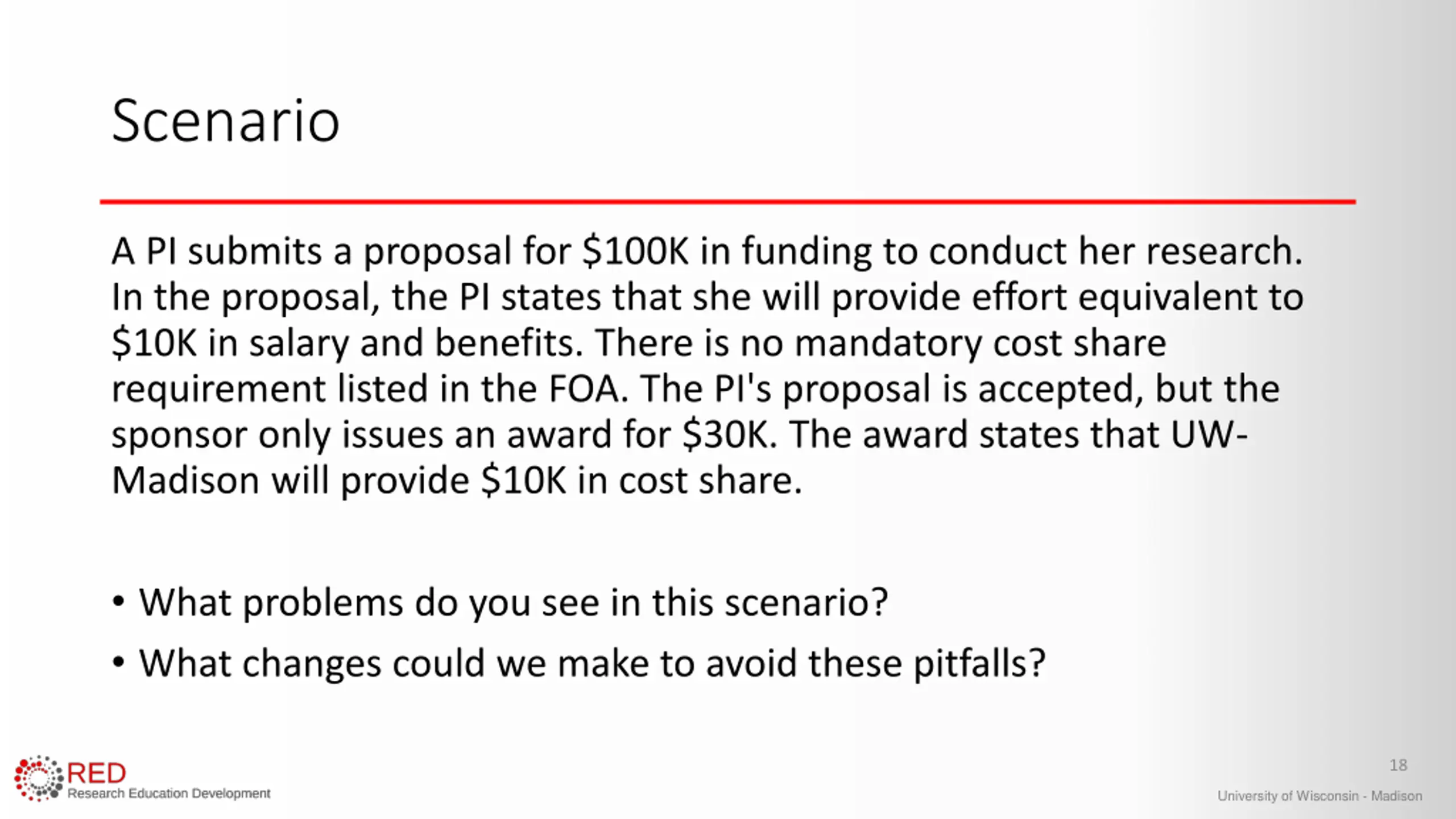 Scenario A PI submits a proposal for $100K in funding to conduct her research. In the proposal, the PI states that she will provide effort equivalent to $10K in salary and benefits. There is no mandatory cost share requirement listed in the FOA. The PI's proposal is accepted, but the sponsor only issues an award for $30K. The award states that UW- Madison will provide $10K in cost share. What problems do you see in this scenario? What changes could we make to avoid these pitfalls? 18 University of Wisconsin - Madison