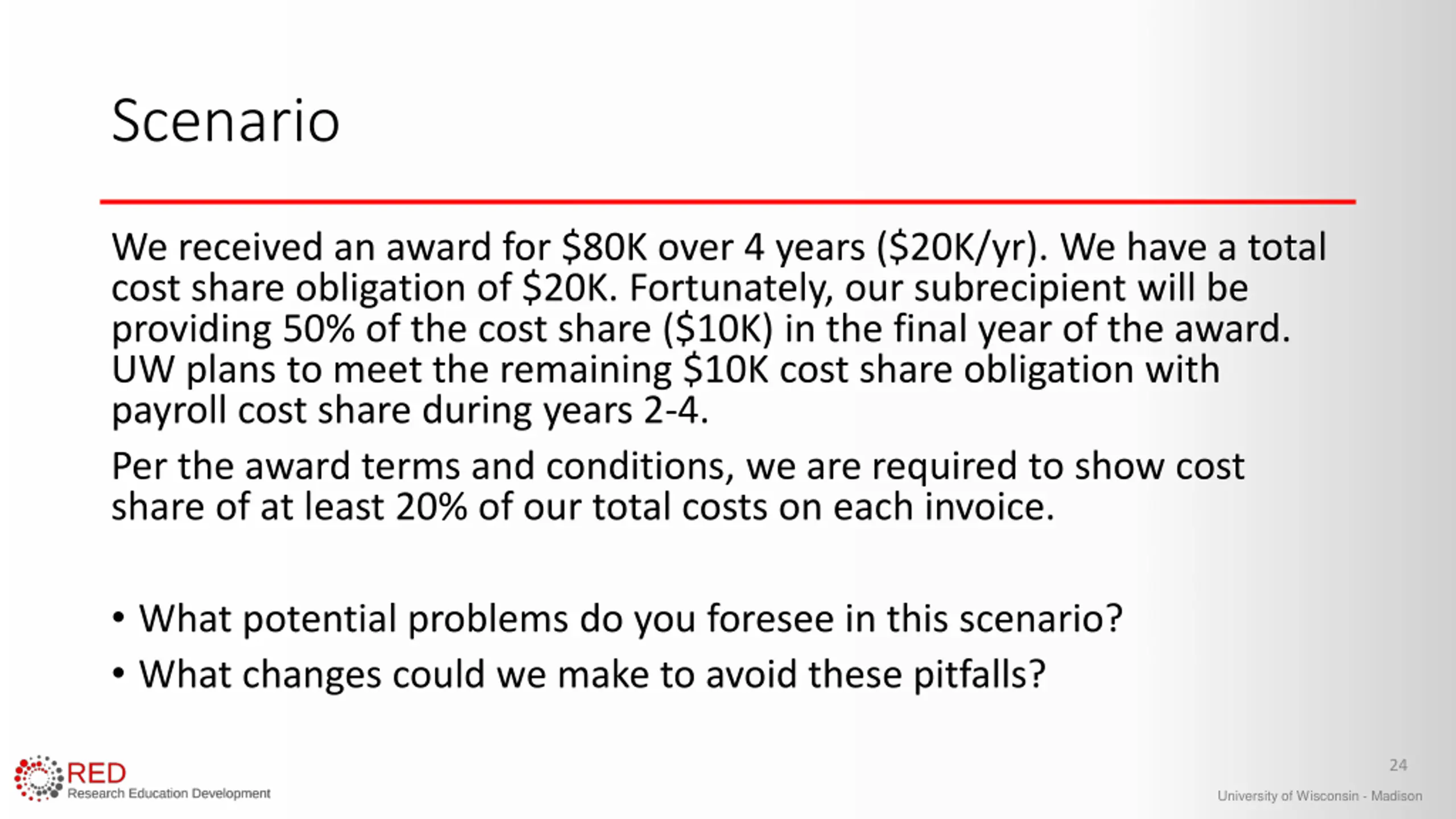 Scenario We received an award for $80K over 4 years ($20K/yr). We have a total cost share obligation of $20K. Fortunately, our subrecipient will be providing 50% of the cost share ($10K) in the final year of the award. UW plans to meet the remaining $10K cost share obligation with payroll cost share during years 2-4. Per the award terms and conditions, we are required to show cost share of at least 20% of our total costs on each invoice. What potential problems do you foresee in this scenario? What changes could we make to avoid these pitfalls? 24 University of Wisconsin - Madison