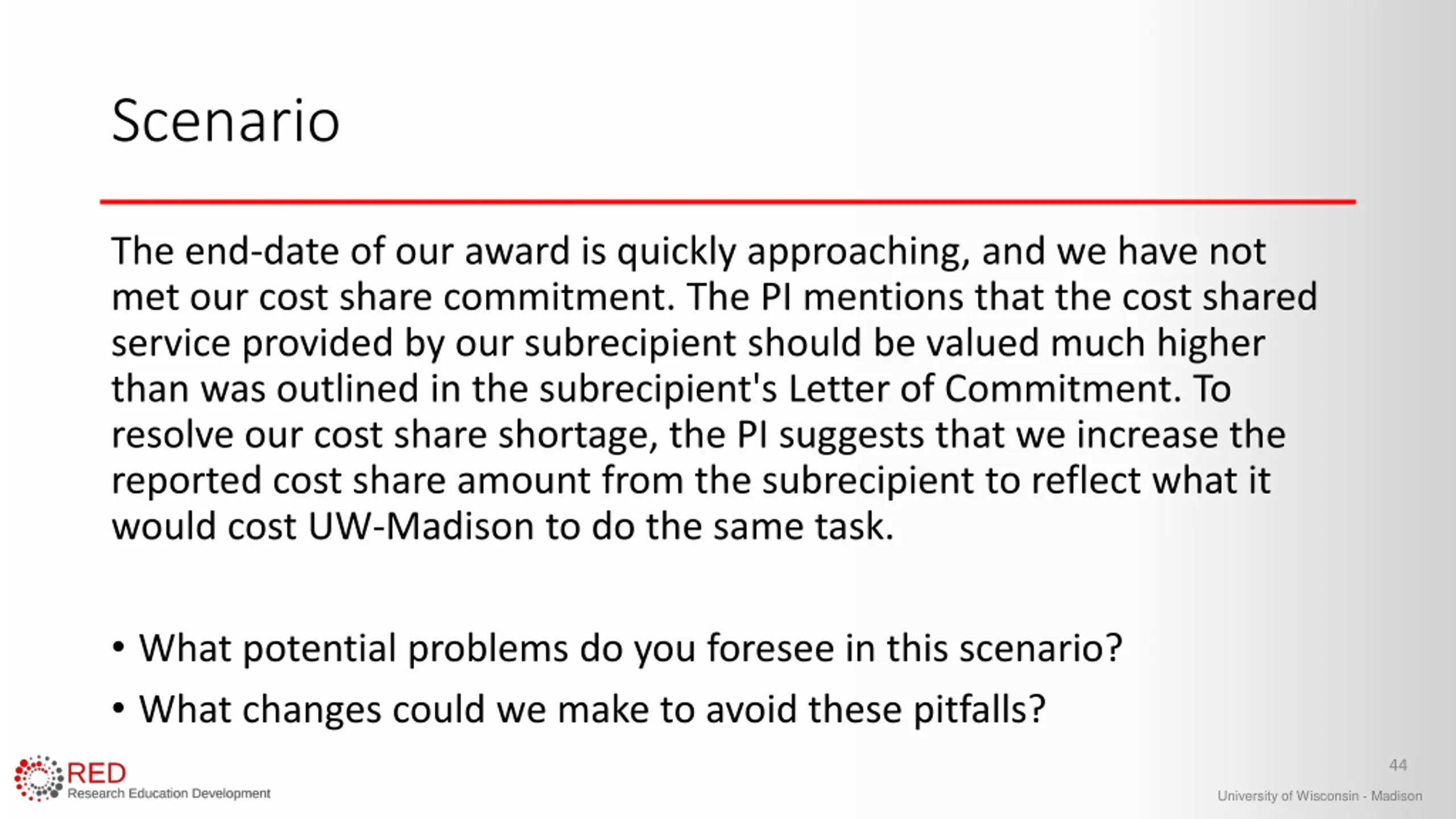 Scenario The end-date of our award is quickly approaching, and we have not met our cost share commitment. The PI mentions that the cost shared service provided by our subrecipient should be valued much higher than was outlined in the subrecipient's Letter of Commitment. To resolve our cost share shortage, the PI suggests that we increase the reported cost share amount from the subrecipient to reflect what it would cost UW-Madison to do the same task. What potential problems do you foresee in this scenario? What changes could we make to avoid these pitfalls? 44 University of Wisconsin - Madison