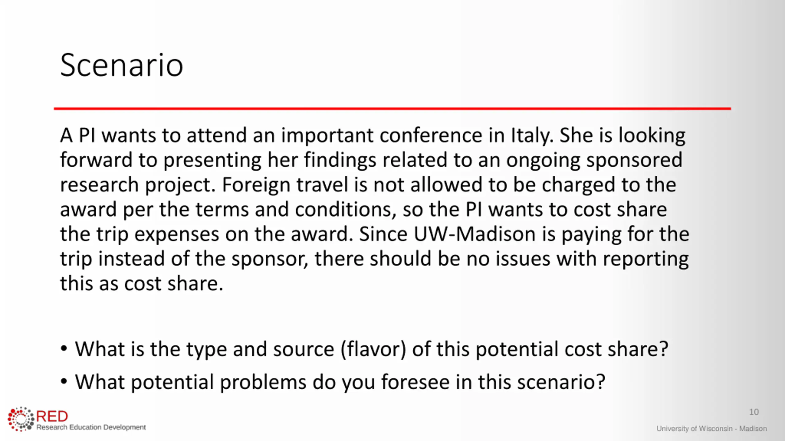 Scenario A PI wants to attend an important conference in Italy. She is looking forward to presenting her findings related to an ongoing sponsored research project. Foreign travel is not allowed to be charged to the award per the terms and conditions, so the PI wants to cost share the trip expenses on the award. Since UW-Madison is paying for the trip instead of the sponsor, there should be no issues with reporting this as cost share. What is the type and source (flavor) of this potential cost share? What potential problems do you foresee in this scenario? 10 University of Wisconsin - Madison