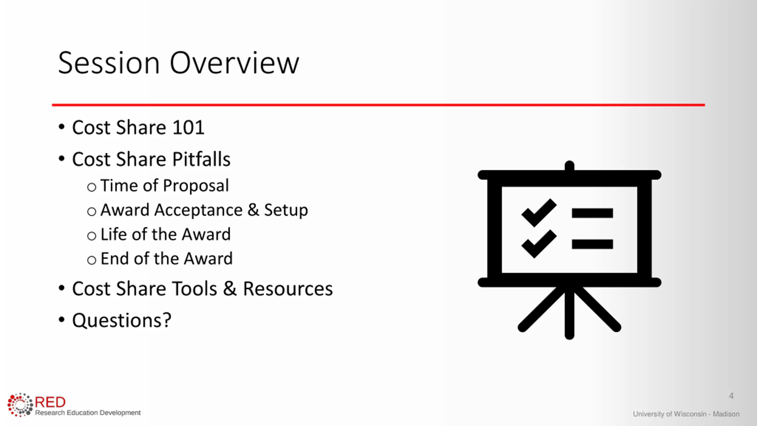 Session Overview Cost Share 101 Cost Share Pitfalls oTime of Proposal oAward Acceptance & Setup oLife of the Award oEnd of the Award Cost Share Tools & Resources Questions? 4 University of Wisconsin - Madison