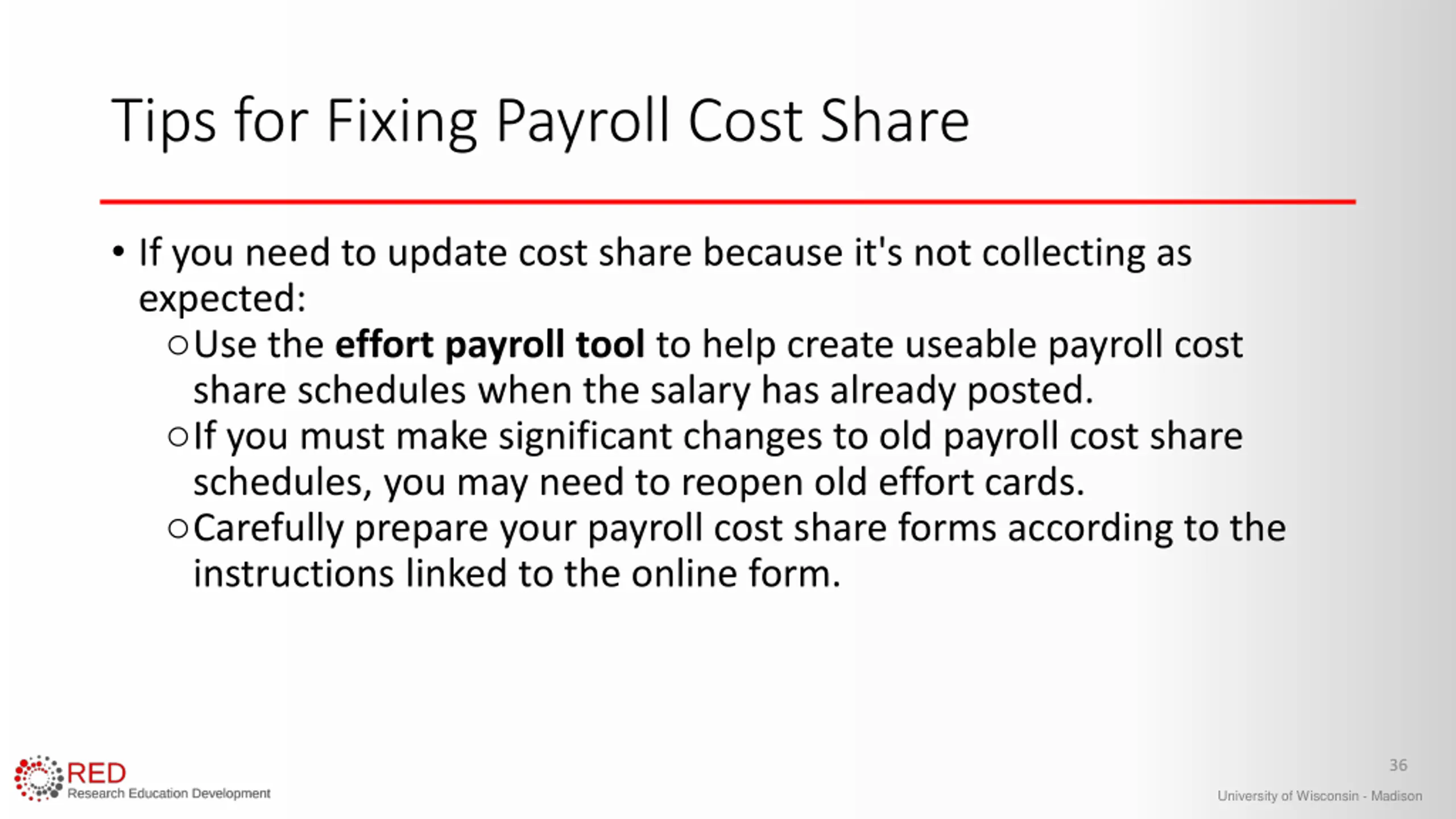 Tips for Fixing Payroll Cost Share If you need to update cost share because it's not collecting as expected: oUse the effort payroll tool to help create useable payroll cost share schedules when the salary has already posted. oIf you must make significant changes to old payroll cost share schedules, you may need to reopen old effort cards. oCarefully prepare your payroll cost share forms according to the instructions linked to the online form. 36 University of Wisconsin - Madison