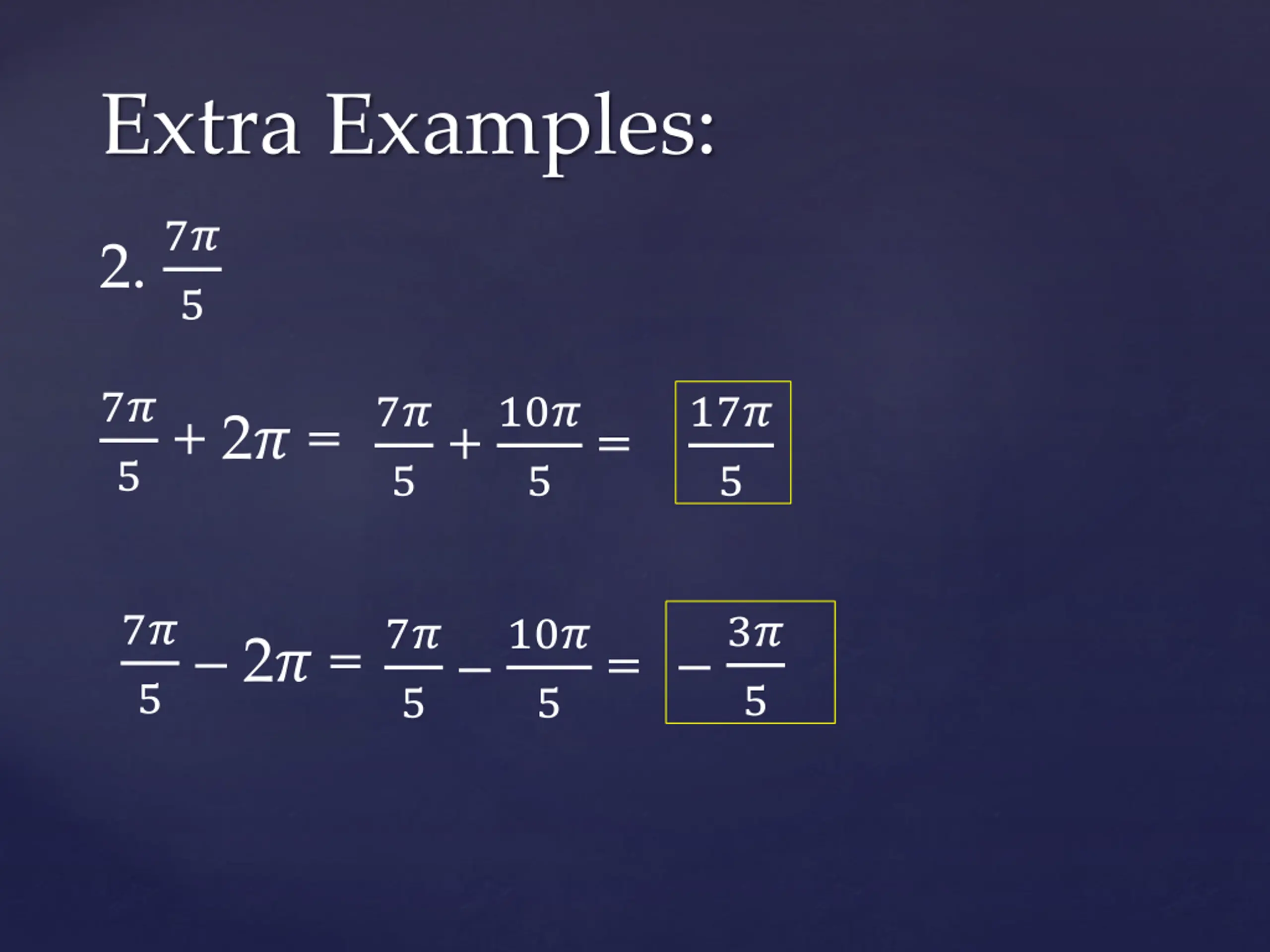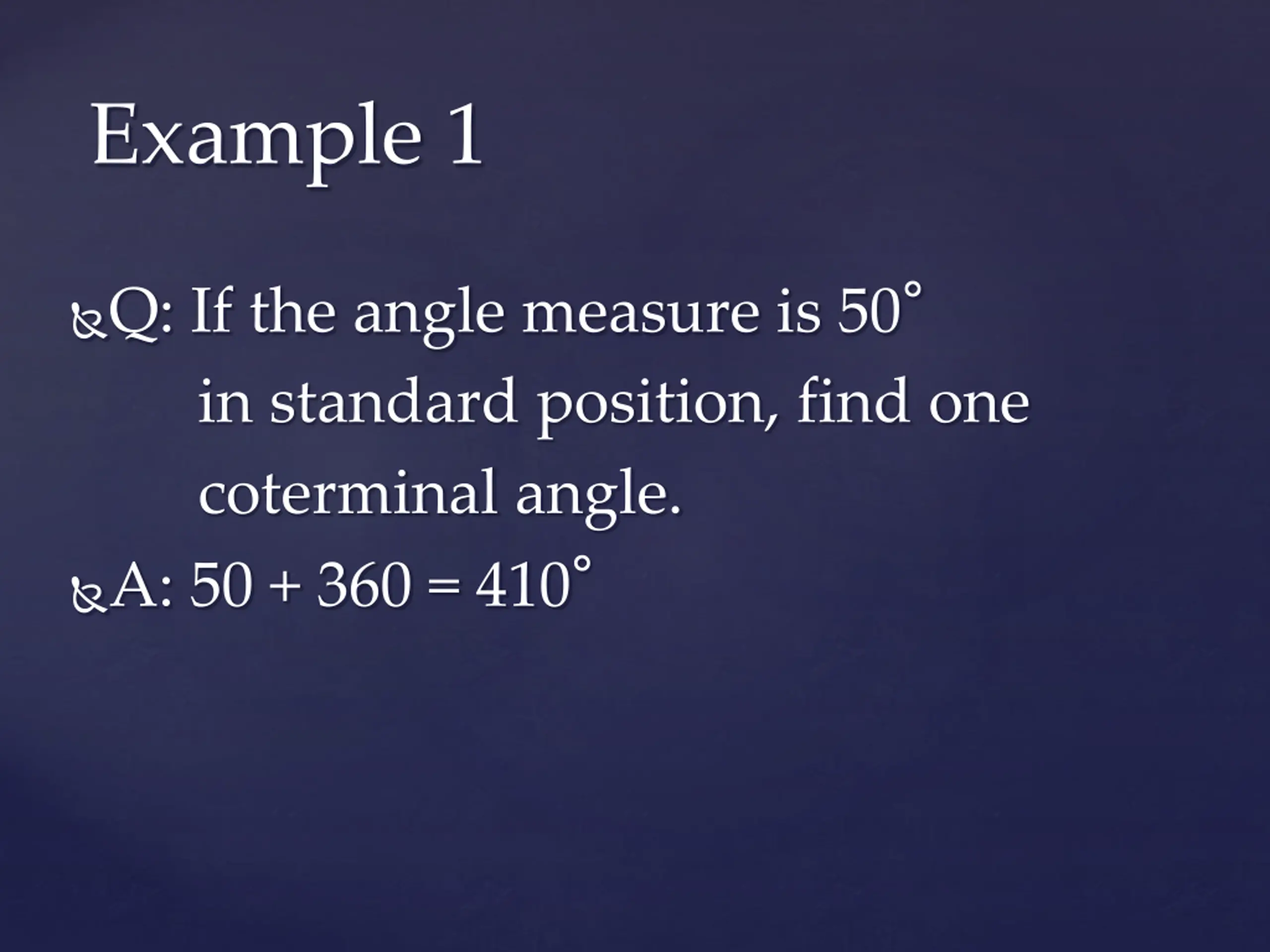Example 1 Q: If the angle measure is 50 in standard position, find one coterminal angle. A: 50 + 360 = 410