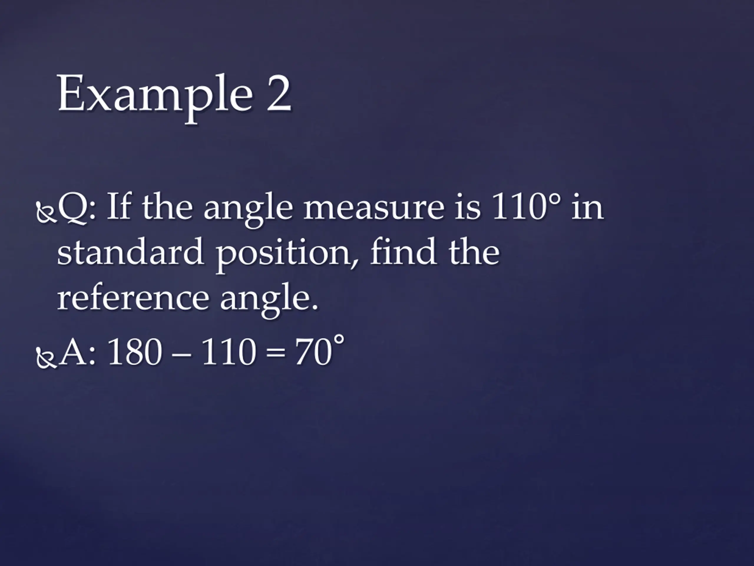 Example 2 Q: If the angle measure is 110 in standard position, find the reference angle. A: 180 110 = 70