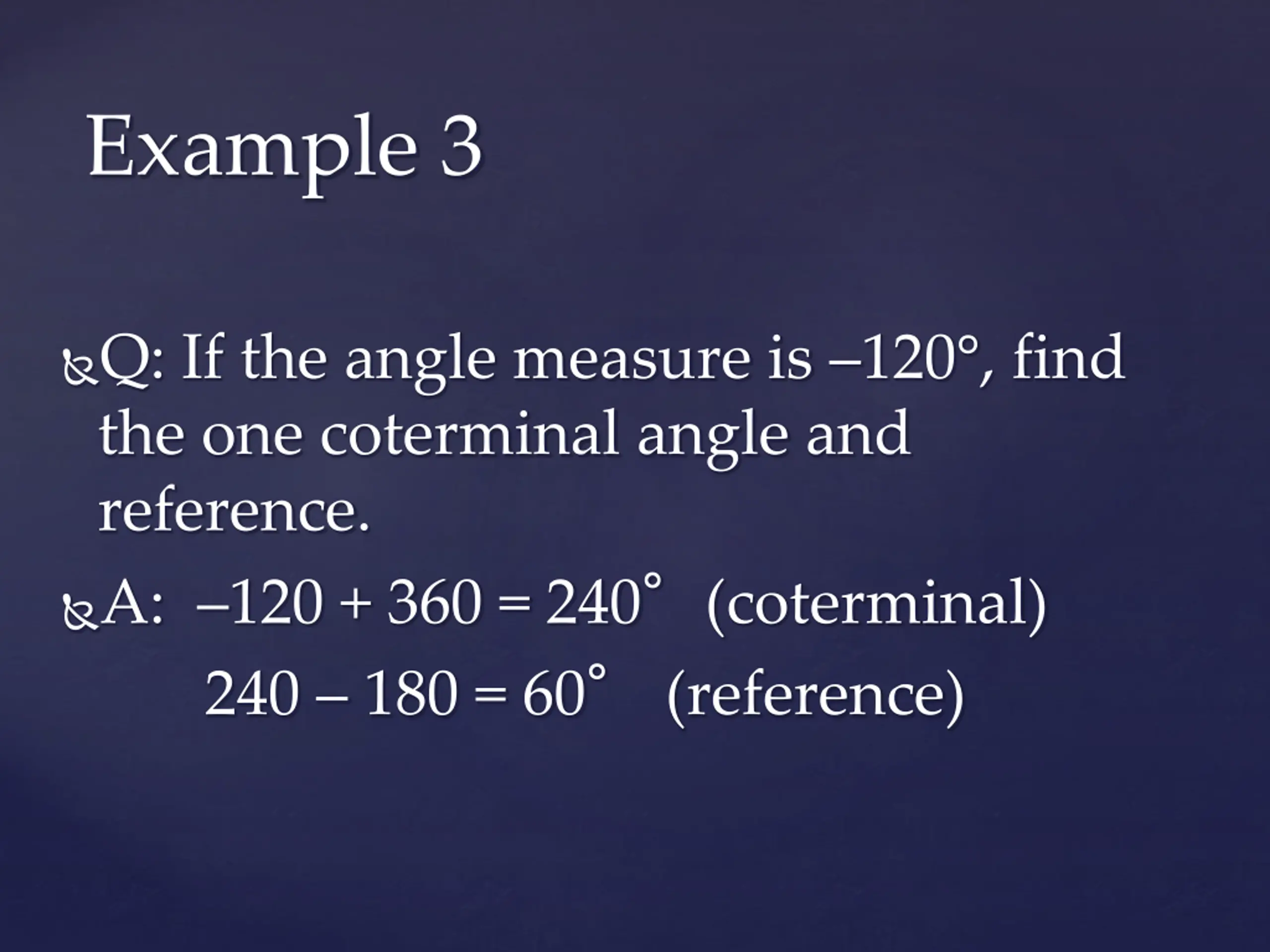 Example 3 Q: If the angle measure is 120 , find the one coterminal angle and reference. A: 120 + 360 = 240 (coterminal) 240 180 = 60 (reference)