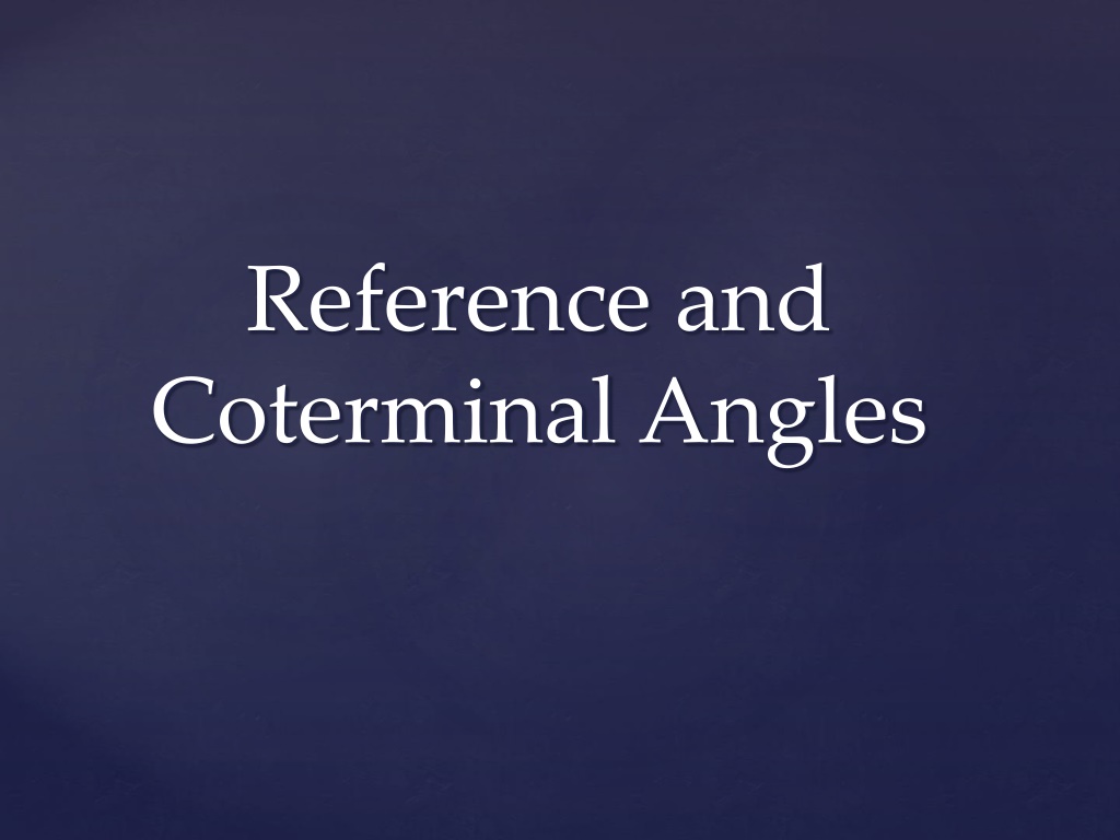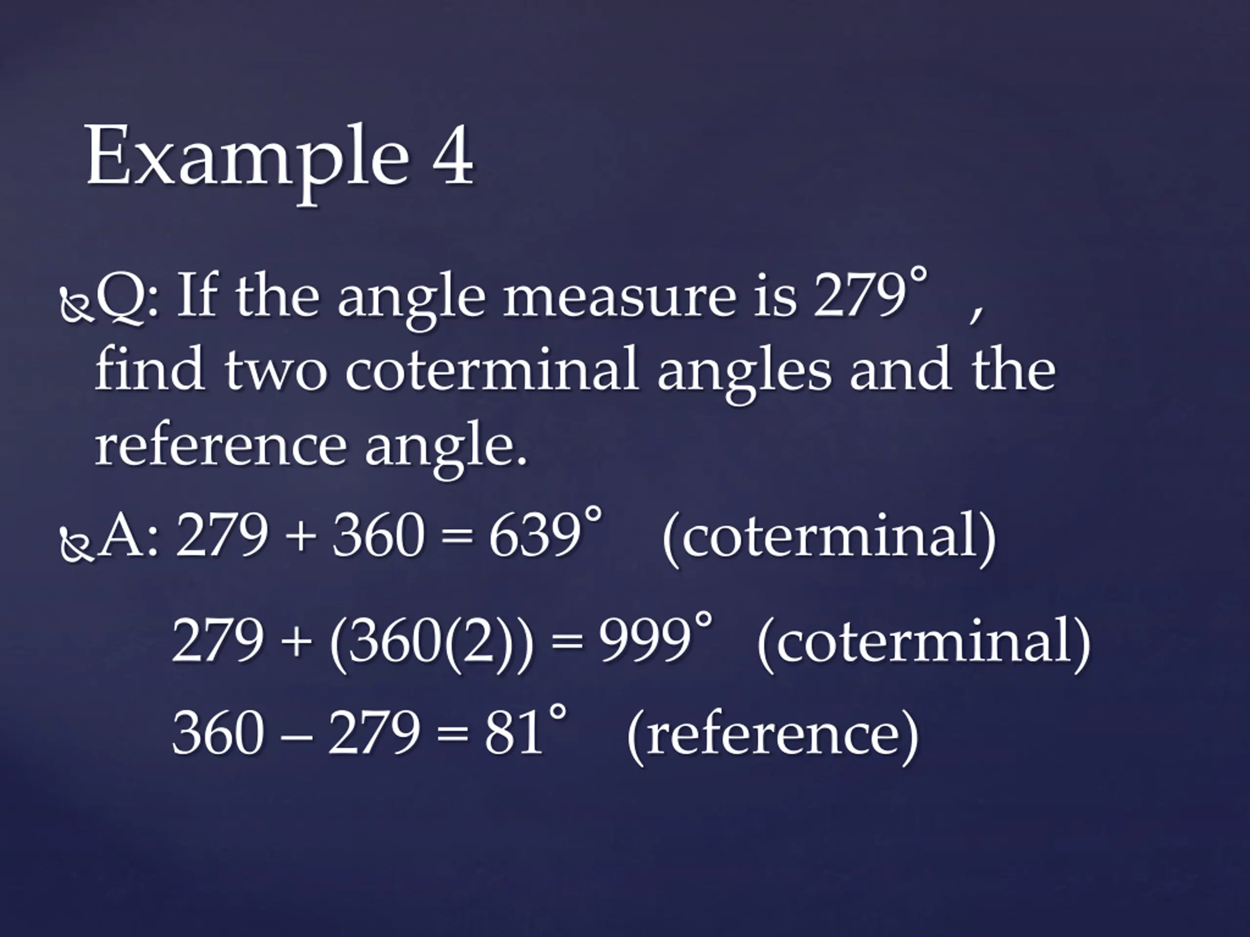 Example 4 Q: If the angle measure is 279 , find two coterminal angles and the reference angle. A: 279 + 360 = 639 (coterminal) 279 + (360(2)) = 999 (coterminal) 360 279 = 81 (reference)