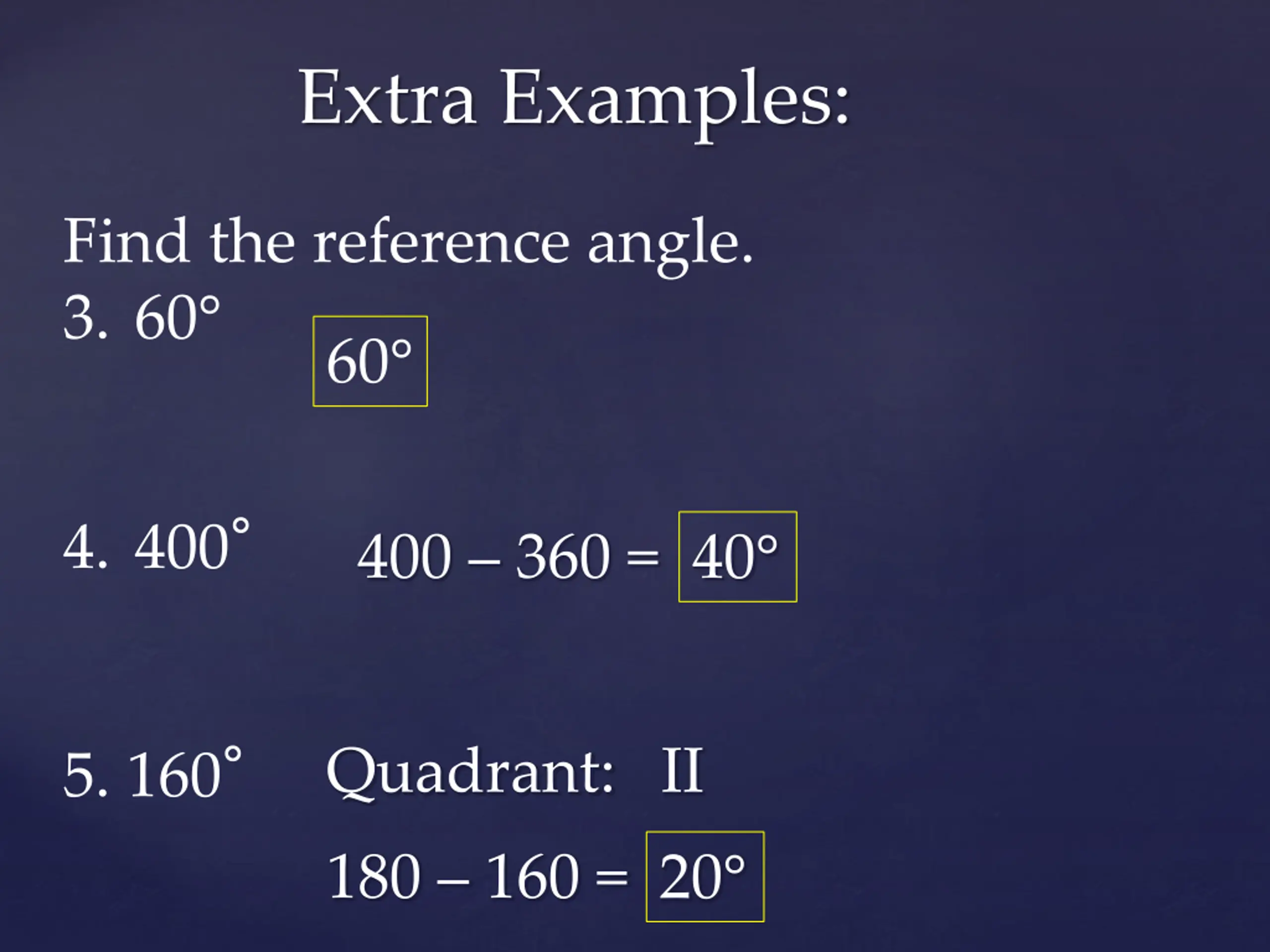 Extra Examples: Find the reference angle. 3. 60 60 4. 400 400 360 = 40 5. 160 Quadrant: II 180 160 = 20