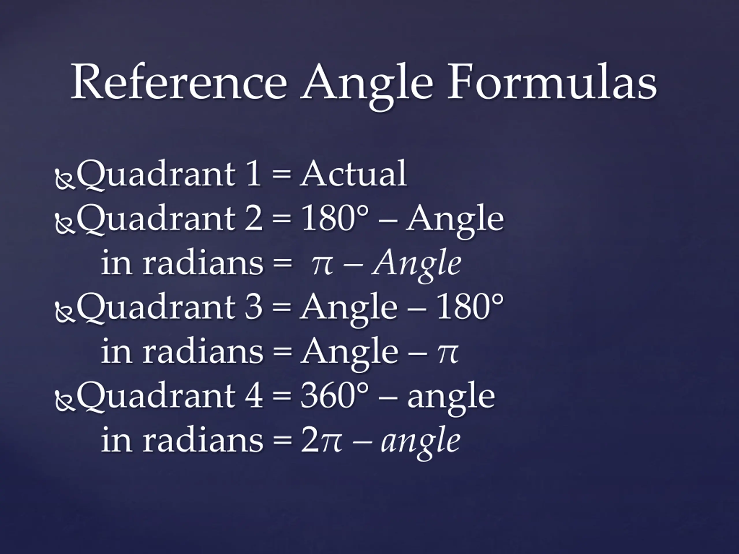 Reference Angle Formulas Quadrant 1 = Actual Quadrant 2 = 180 Angle in radians = Angle Quadrant 3 = Angle 180 in radians = Angle Quadrant 4 = 360 angle in radians = 2 angle