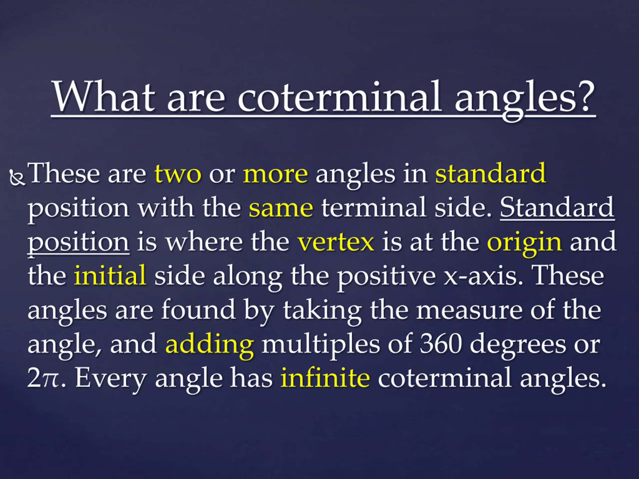 What are coterminal angles? These are two or more angles in standard position with the same terminal side. Standard position is where the vertex is at the origin and the initial side along the positive x-axis. These angles are found by taking the measure of the angle, and adding multiples of 360 degrees or 2 . Every angle has infinite coterminal angles.