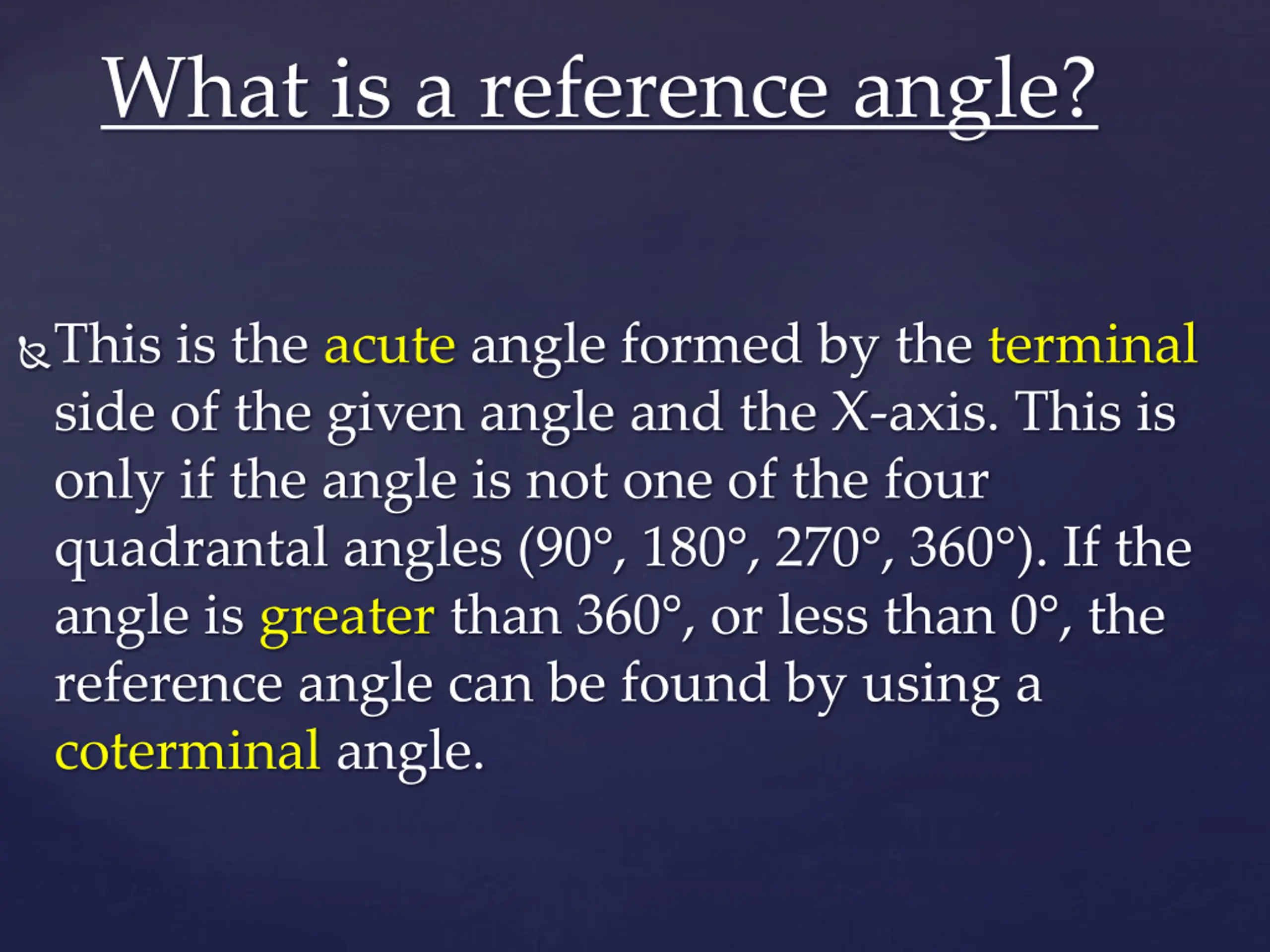 What is a reference angle? This is the acute angle formed by the terminal side of the given angle and the X-axis. This is only if the angle is not one of the four quadrantal angles (90 , 180 , 270 , 360 ). If the angle is greater than 360 , or less than 0 , the reference angle can be found by using a coterminal angle.
