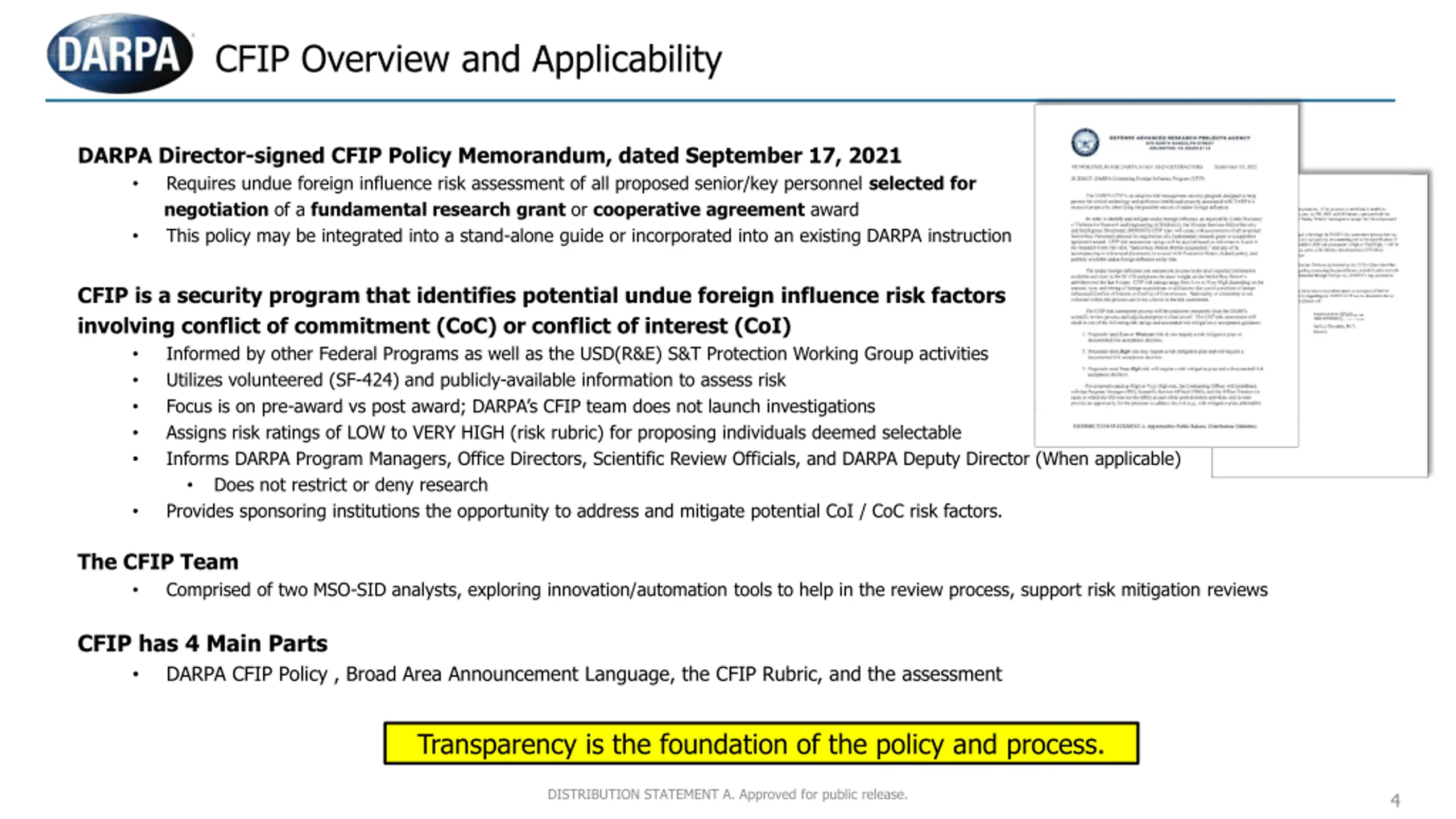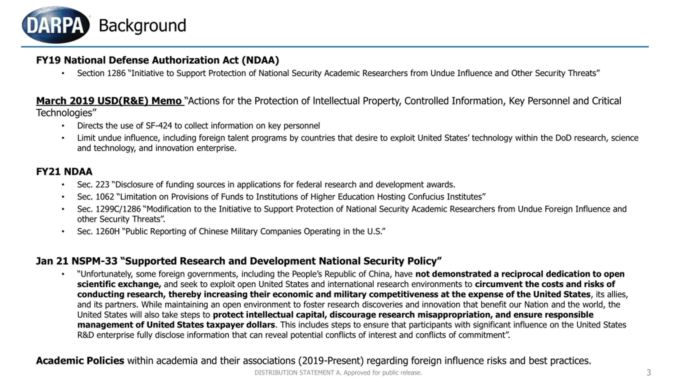 Background FY19 National Defense Authorization Act (NDAA) Section 1286 Initiative to Support Protection of National Security Academic Researchers from Undue Influence and Other Security Threats March 2019 USD(R&E) Memo Actions for the Protection of lntellectual Property, Controlled Information, Key Personnel and Critical Technologies Directs the use of SF-424 to collect information on key personnel Limit undue influence, including foreign talent programs by countries that desire to exploit United States technology within the DoD research, science and technology, and innovation enterprise. FY21 NDAA Sec. 223 Disclosure of funding sources in applications for federal research and development awards. Sec. 1062 Limitation on Provisions of Funds to Institutions of Higher Education Hosting Confucius Institutes Sec. 1299C/1286 Modification to the Initiative to Support Protection of National Security Academic Researchers from Undue Foreign Influence and other Security Threats . Sec. 1260H Public Reporting of Chinese Military Companies Operating in the U.S. Jan 21 NSPM-33 Supported Research and Development National Security Policy Unfortunately, some foreign governments, including the People s Republic of China, have not demonstrated a reciprocal dedication to open scientific exchange, and seek to exploit open United States and international research environments to circumvent the costs and risks of conducting research, thereby increasing their economic and military competitiveness at the expense of the United States, its allies, and its partners. While maintaining an open environment to foster research discoveries and innovation that benefit our Nation and the world, the United States will also take steps to protect intellectual capital, discourage research misappropriation, and ensure responsible management of United States taxpayer dollars. This includes steps to ensure that participants with significant influence on the United States R&D enterprise fully disclose information that can reveal potential conflicts of interest and conflicts of commitment . Academic Policies within academia and their associations (2019-Present) regarding foreign influence risks and best practices. DISTRIBUTION STATEMENT A. Approved for public release. 3