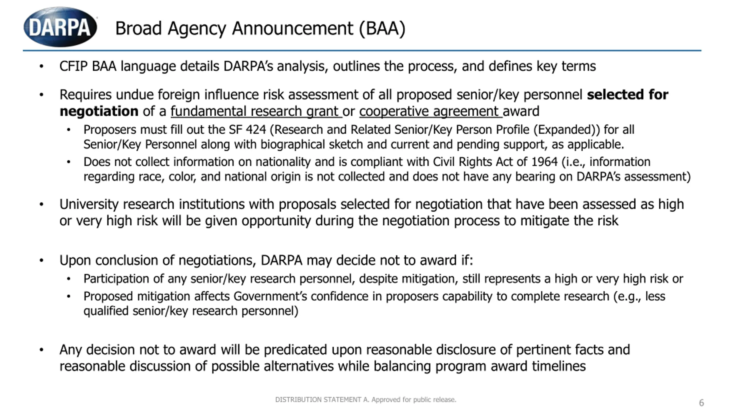Broad Agency Announcement (BAA) CFIP BAA language details DARPA s analysis, outlines the process, and defines key terms Requires undue foreign influence risk assessment of all proposed senior/key personnel selectedfor negotiation of a fundamental research grant or cooperative agreement award Proposers must fill out the SF 424 (Research and Related Senior/Key Person Profile (Expanded)) for all Senior/Key Personnel along with biographical sketch and current and pending support, as applicable. Does not collect information on nationality and is compliant with Civil Rights Act of 1964 (i.e., information regarding race, color, and national origin is not collected and does not have any bearing on DARPA s assessment) University research institutions with proposals selected for negotiation that have been assessed as high or very high risk will be given opportunity during the negotiation process to mitigate the risk Upon conclusion of negotiations, DARPA may decide not to award if: Participation of any senior/key research personnel, despite mitigation, still represents a high or very high risk or Proposed mitigation affects Government s confidence in proposers capability to complete research (e.g., less qualified senior/key research personnel) Any decision not to award will be predicated upon reasonable disclosure of pertinent facts and reasonable discussion of possible alternatives while balancing program award timelines DISTRIBUTION STATEMENT A. Approved for public release. 6