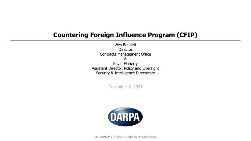 Countering Foreign Influence Program (CFIP) Wes Bennett Director Contracts Management Office & Kevin Flaherty Assistant Director, Policy and Oversight Security & Intelligence Directorate December 8, 2021 DISTRIBUTION STATEMENT A. Approved for public release.