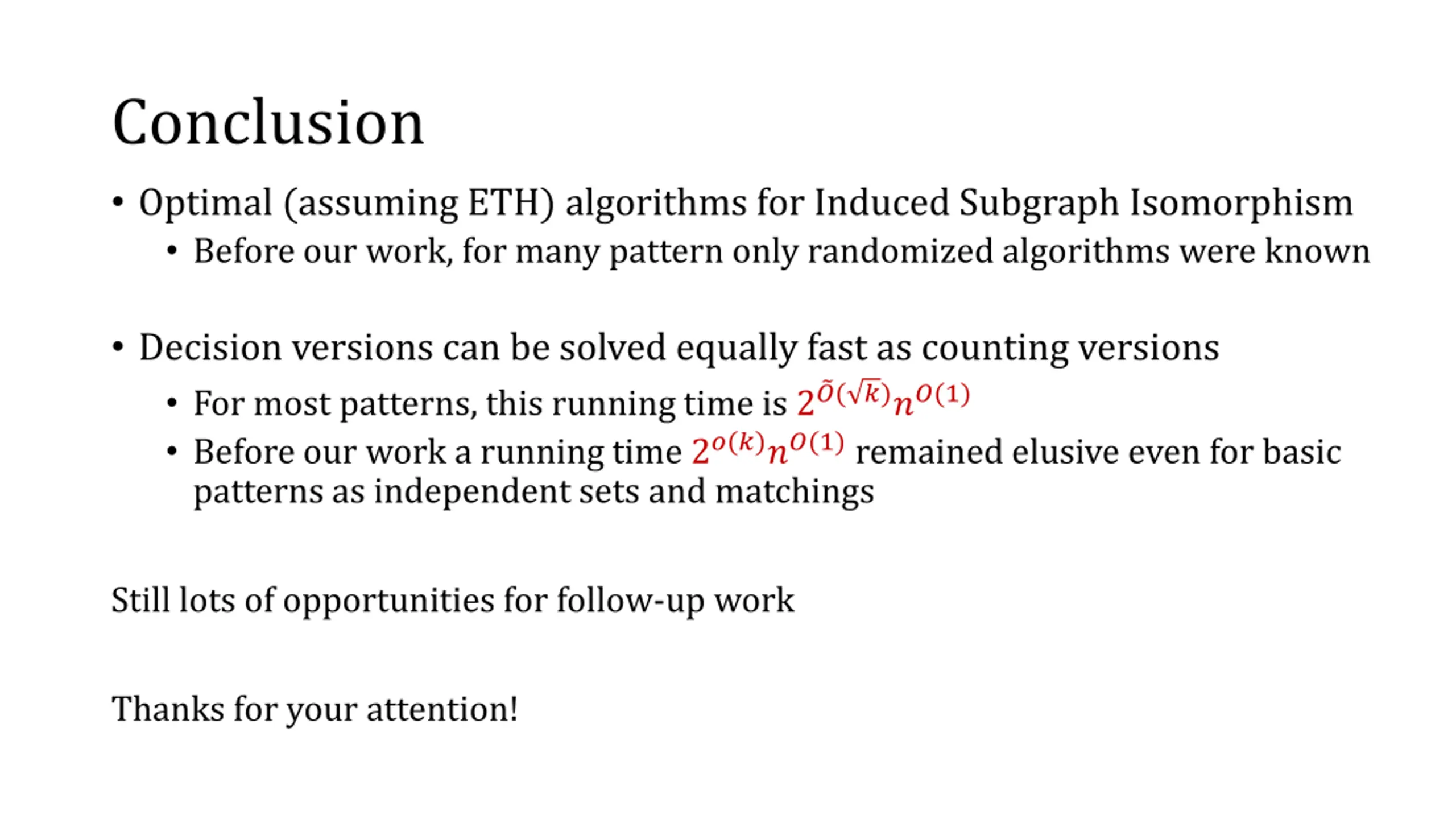 Conclusion Optimal (assuming ETH) algorithms for Induced Subgraph Isomorphism Before our work, for many pattern only randomized algorithms were known Decision versions can be solved equally fast as counting versions For most patterns, this running time is 2 ?( ?)??(1) Before our work a running time 2?(?)??(1) remained elusive even for basic patterns as independent sets and matchings Still lots of opportunities for follow-up work Thanks for your attention!