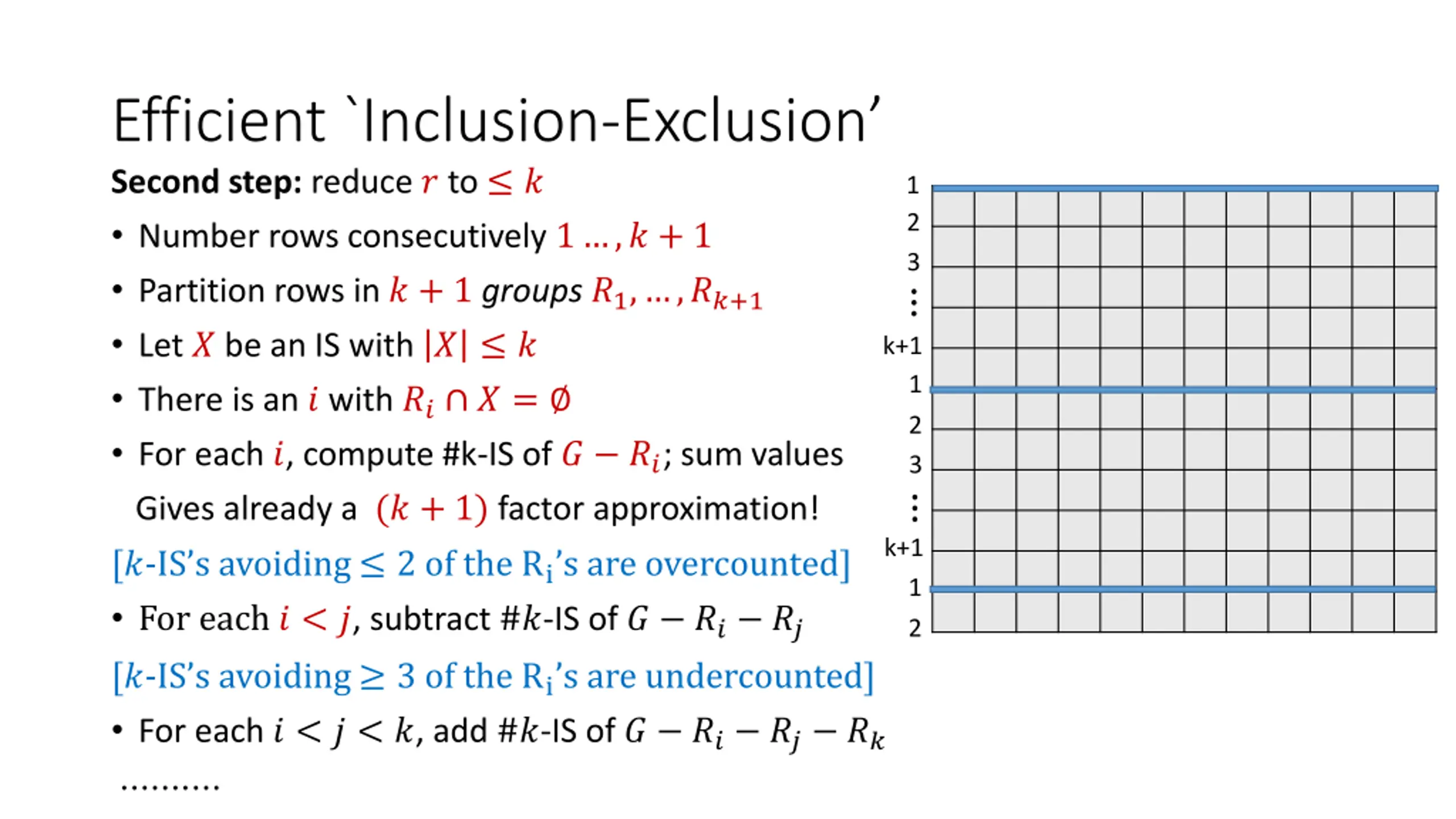 Efficient `Inclusion-Exclusion Second step: reduce ? to ? Number rows consecutively 1 ,? + 1 Partition rows in ? + 1groups ?1, ,??+1 Let ? be an IS with ? ? There is an ? with ?? ? = For each ?, compute #k-IS of ? ??; sum values Gives already a (? + 1) factor approximation! 1 2 3 k+1 1 2 3 k+1 [?-IS s avoiding 2 of the Ri s are overcounted] For each ? < ?, subtract #?-IS of ? ?? ?? [?-IS s avoiding 3 of the Ri s are undercounted] For each ? < ? < ?, add #?-IS of ? ?? ?? ?? 1 2