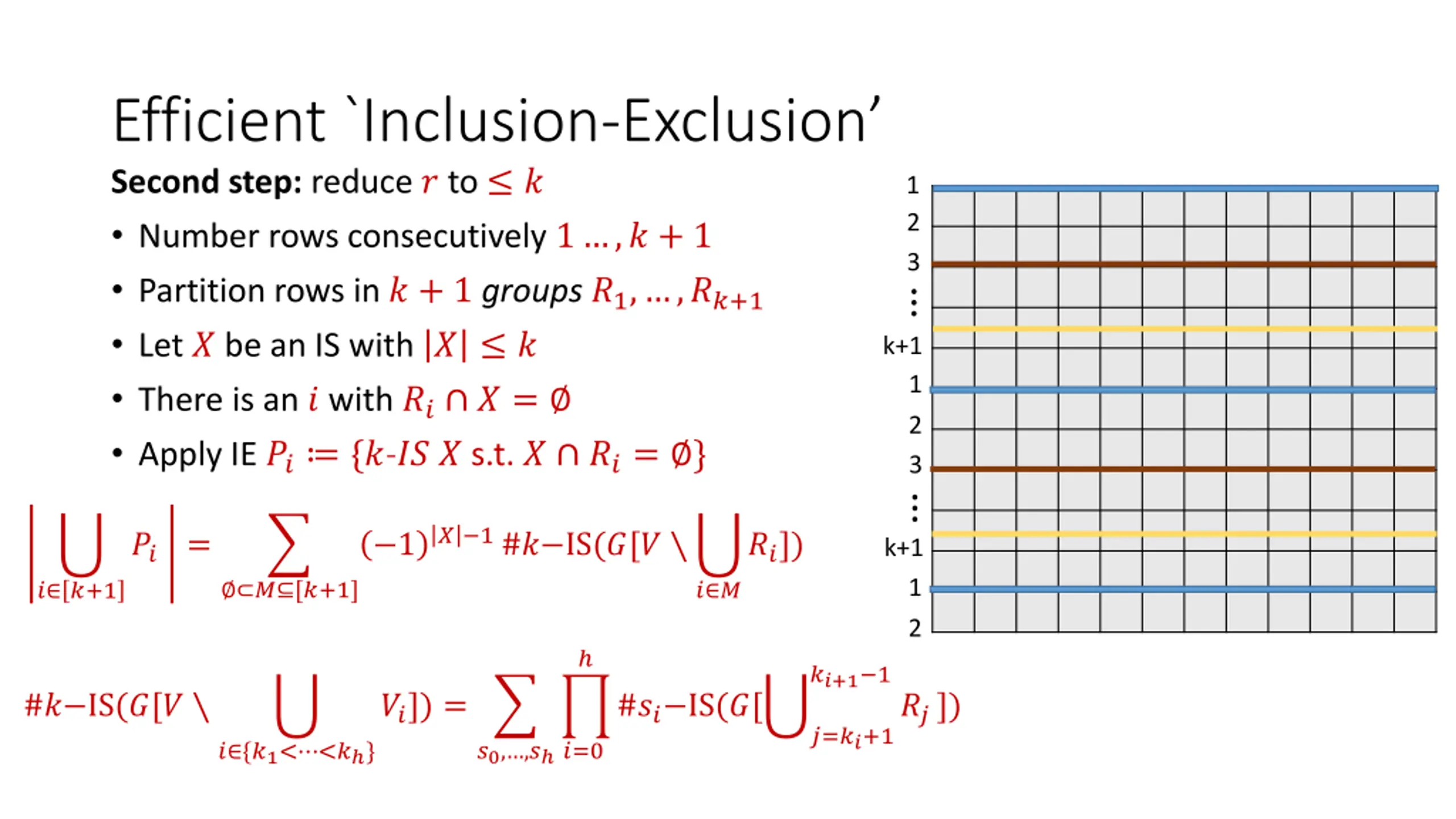 Efficient `Inclusion-Exclusion Second step: reduce ? to ? Number rows consecutively 1 ,? + 1 Partition rows in ? + 1groups ?1, ,??+1 Let ? be an IS with ? ? There is an ? with ?? ? = Apply IE ?? {?-?? ? s.t. ? ??= } 1 2 3 k+1 1 2 3 ? 1#? IS(?[? ?? = 1 ??]) k+1 1 2 ? [?+1] ? ? ? ?+1 ??+1 1 #? IS(?[? ??]) = #?? IS(?[ ??]) ?=??+1 ?0, ,? ?=0 ? {?1< <? }
