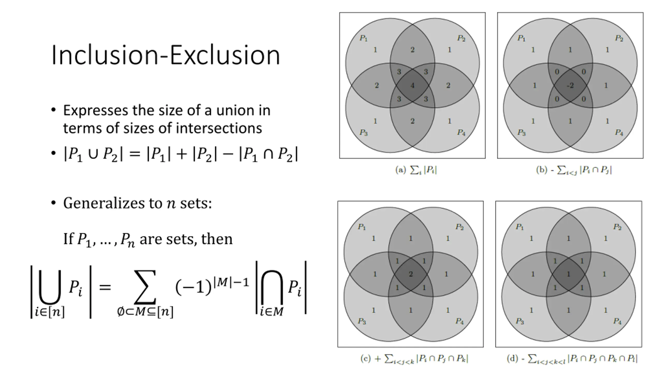 Inclusion-Exclusion Expresses the size of a union in terms of sizes of intersections ?1 ?2 = ?1+ ?2 ?1 ?2 Generalizes to ? sets: If ?1, ,?? are sets, then ? 1 ?? = 1 ?? ? [?] ? ? ? ?