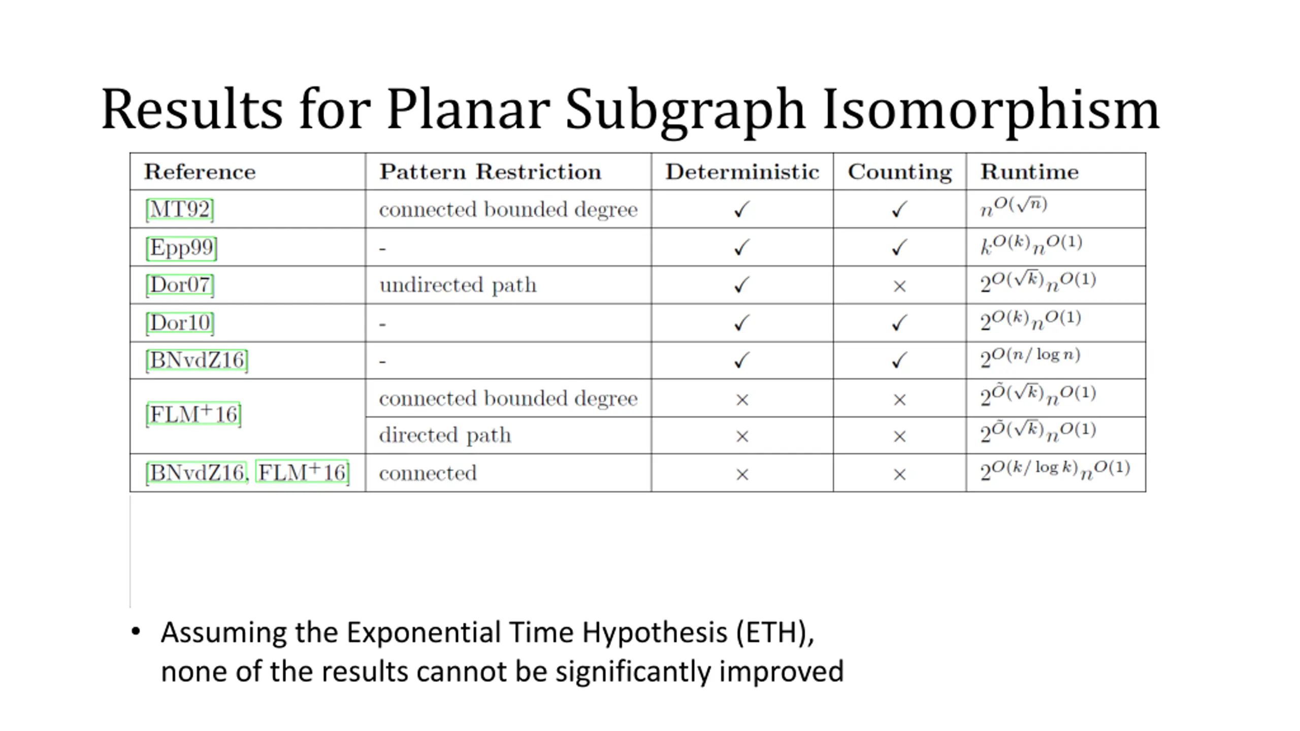 Results for Planar Subgraph Isomorphism Assuming the Exponential Time Hypothesis (ETH), none of the results cannot be significantly improved