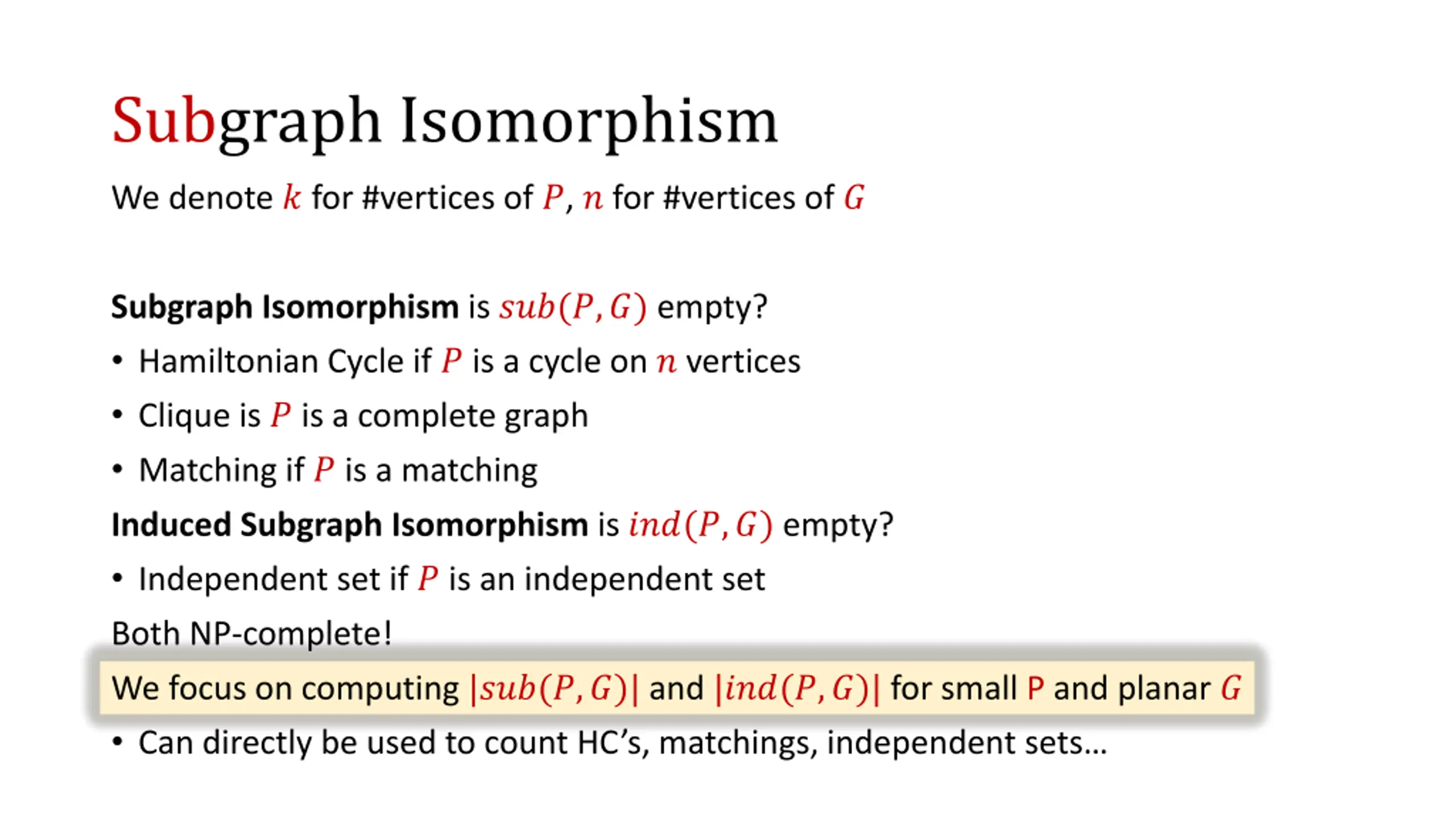 Subgraph Isomorphism We denote ? for #vertices of ?, ? for #vertices of ? Subgraph Isomorphism is ???(?,?) empty? Hamiltonian Cycle if ? is a cycle on ? vertices Clique is ? is a complete graph Matching if ? is a matching Induced Subgraph Isomorphism is ???(?,?) empty? Independent set if ? is an independent set Both NP-complete! We focus on computing |???(?,?)| and |???(?,?)| for small P and planar ? Can directly be used to count HC s, matchings, independent sets