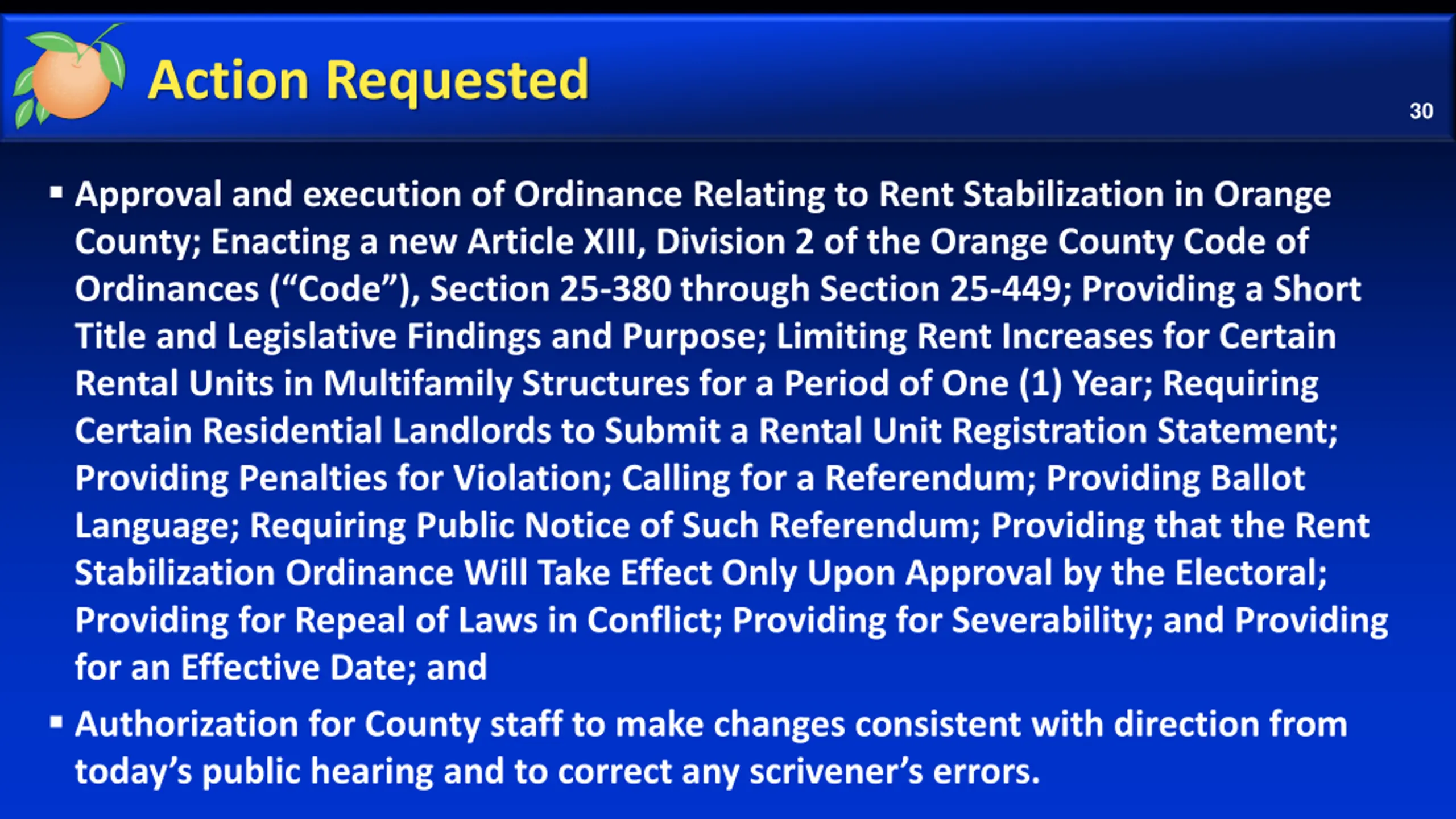 Action Requested 30 Approval and execution of Ordinance Relating to Rent Stabilization in Orange County; Enacting a new Article XIII, Division 2 of the Orange County Code of Ordinances ( Code ), Section 25-380 through Section 25-449; Providing a Short Title and Legislative Findings and Purpose; Limiting Rent Increases for Certain Rental Units in Multifamily Structures for a Period of One (1) Year; Requiring Certain Residential Landlords to Submit a Rental Unit Registration Statement; Providing Penalties for Violation; Calling for a Referendum; Providing Ballot Language; Requiring Public Notice of Such Referendum; Providing that the Rent Stabilization Ordinance Will Take Effect Only Upon Approval by the Electoral; Providing for Repeal of Laws in Conflict; Providing for Severability; and Providing for an Effective Date; and Authorization for County staff to make changes consistent with direction from today s public hearing and to correct any scrivener s errors.
