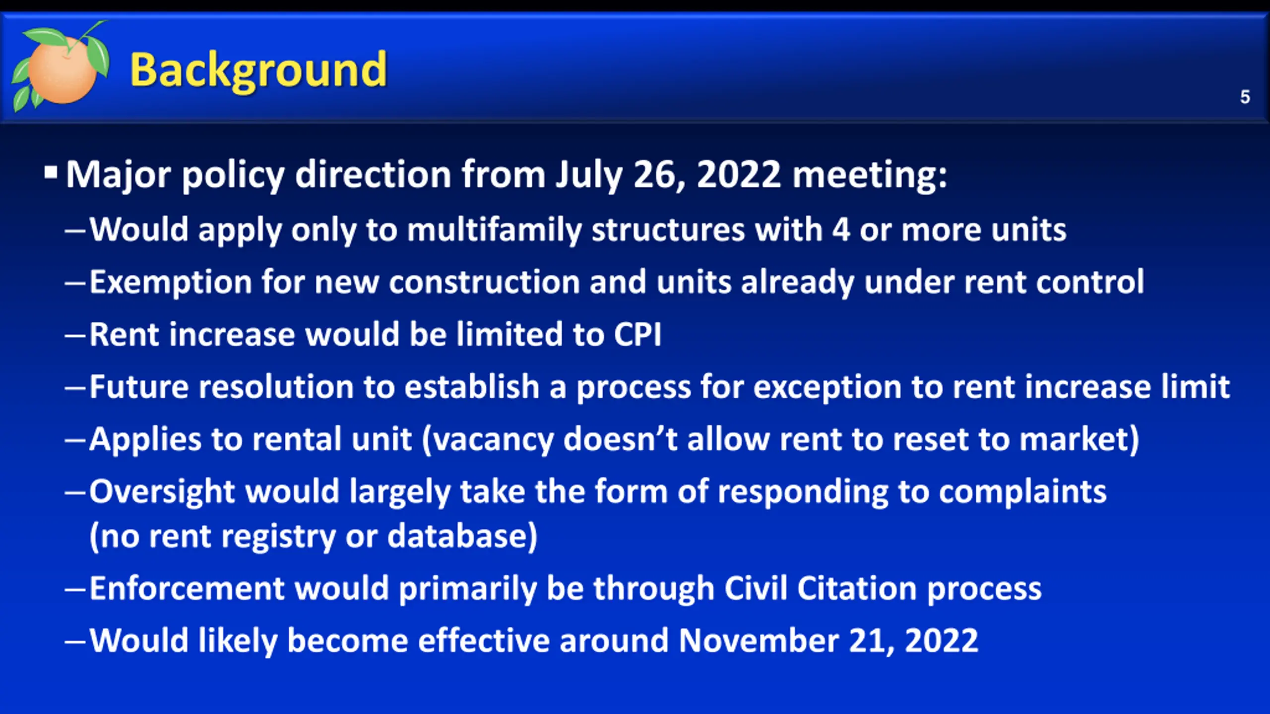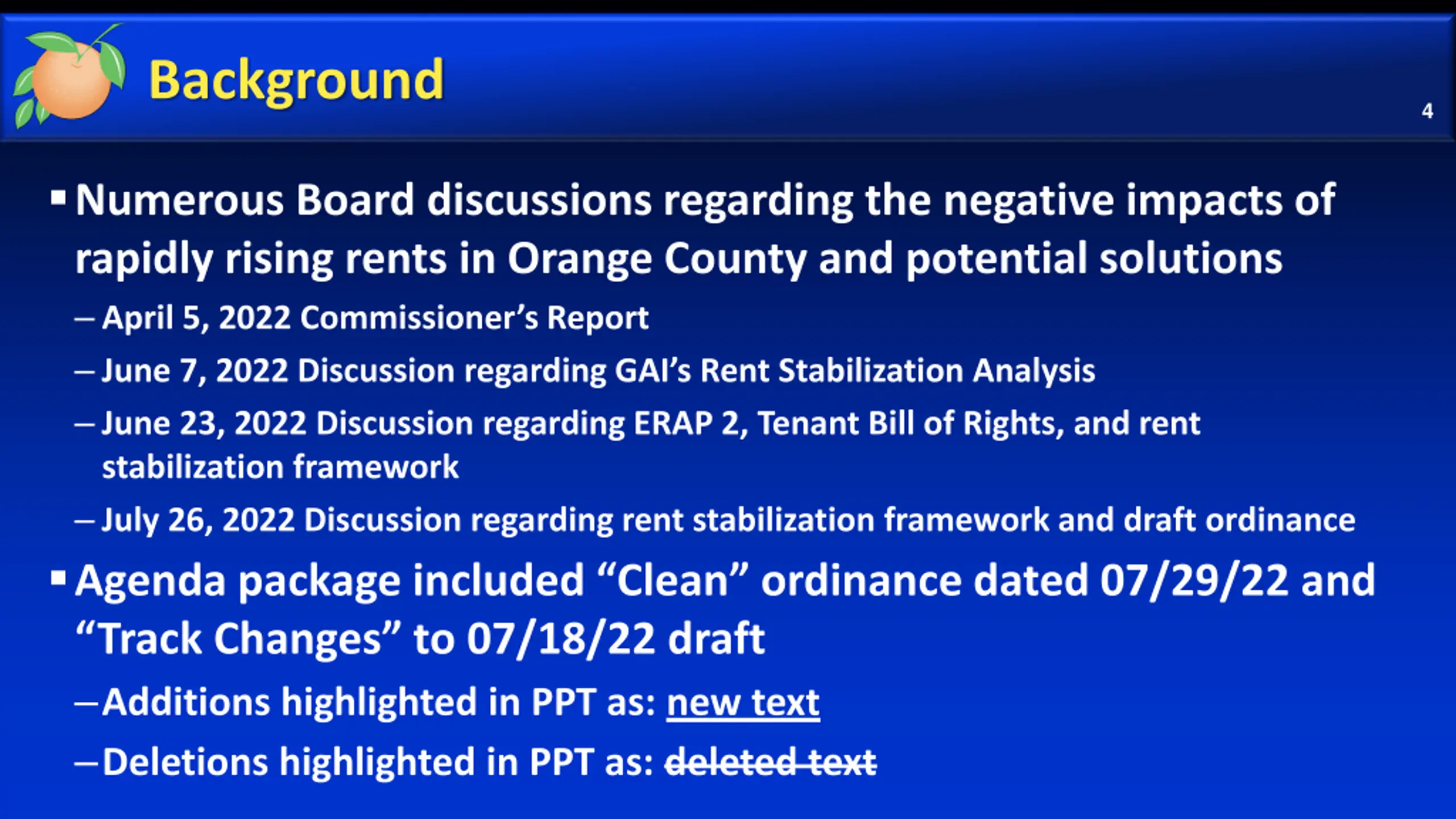 Background 4 Numerous Board discussions regarding the negative impacts of rapidly rising rents in Orange County and potential solutions April 5, 2022 Commissioner s Report June 7, 2022 Discussion regarding GAI s Rent Stabilization Analysis June 23, 2022 Discussion regarding ERAP 2, Tenant Bill of Rights, and rent stabilization framework July 26, 2022 Discussion regarding rent stabilization framework and draft ordinance Agenda package included Clean ordinance dated 07/29/22 and Track Changes to 07/18/22 draft Additions highlighted in PPT as: new text Deletions highlighted in PPT as: deleted text