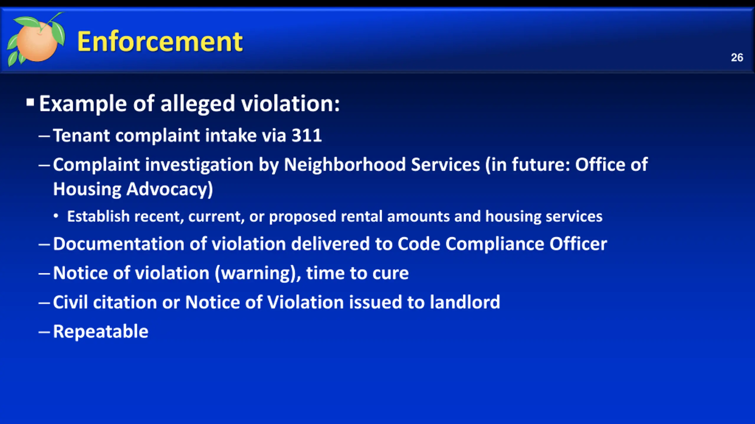 Enforcement 26 Example of alleged violation: Tenant complaint intake via 311 Complaint investigation by Neighborhood Services (in future: Office of Housing Advocacy) Establish recent, current, or proposed rental amounts and housing services Documentation of violation delivered to Code Compliance Officer Notice of violation (warning), time to cure Civil citation or Notice of Violation issued to landlord Repeatable