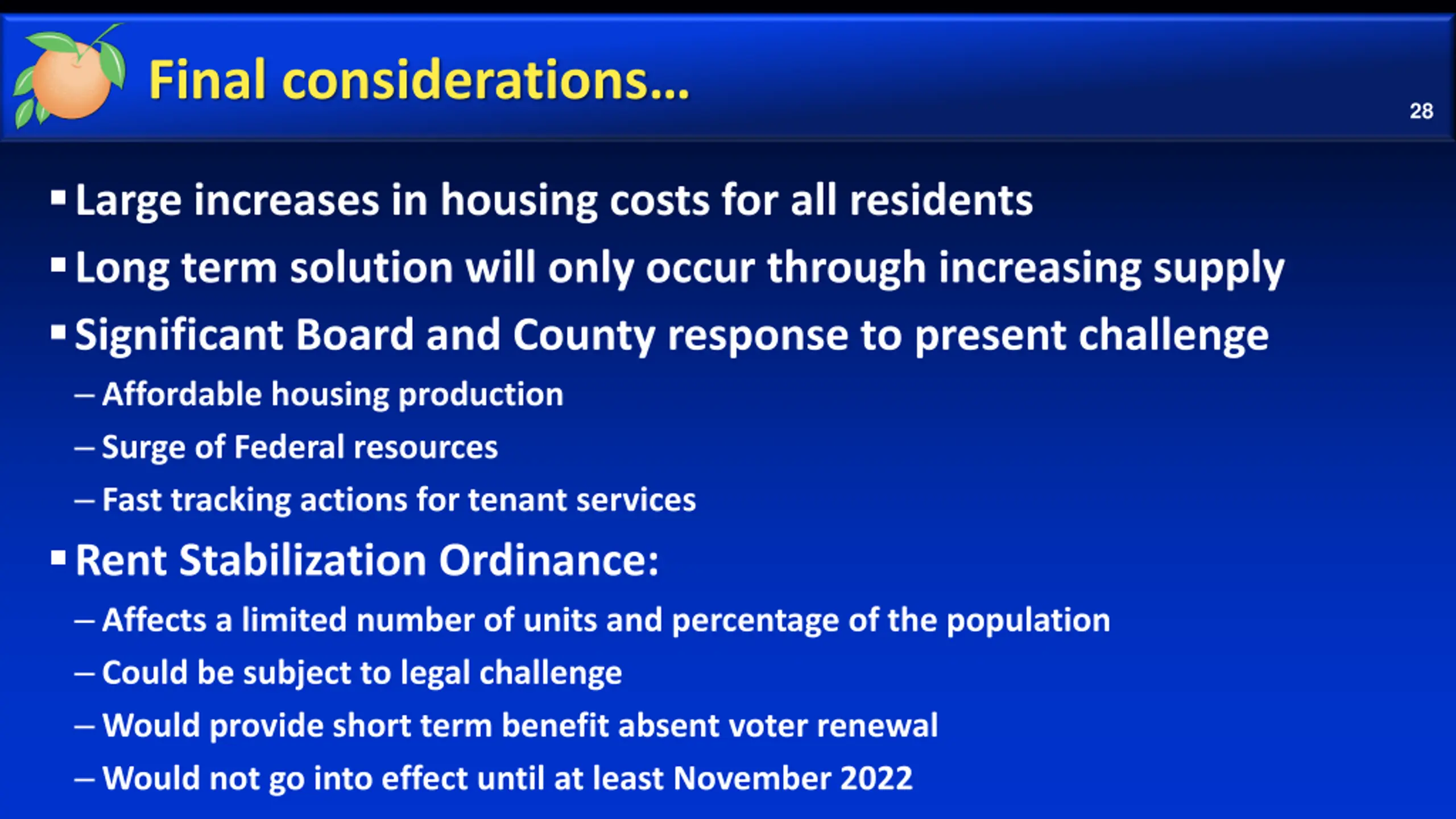 Final considerations 29 Uncertain how market would respond: Significant rent increases for lease renewals immediately preceding or following measure period Increased or decreased lease duration Include other charges beyond rent Possible conversions from rental to ownership Possible decrease of new construction due to regulatory uncertainty Possible reduction of housing quality standards and re-investment