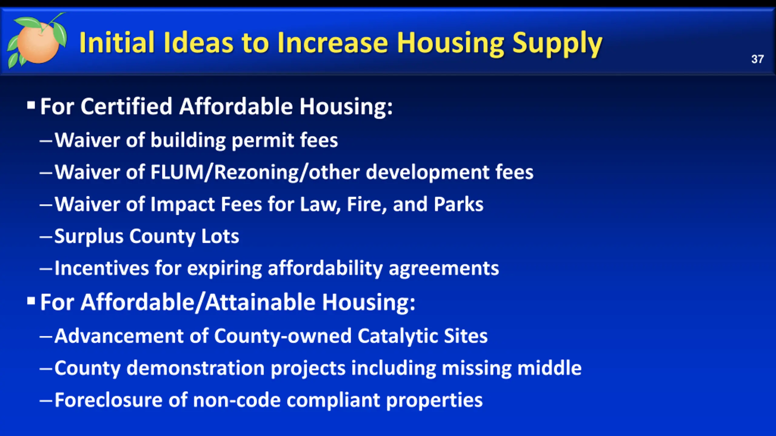 Initial Ideas to Increase Housing Supply 37 For Certified Affordable Housing: Waiver of building permit fees Waiver of FLUM/Rezoning/other development fees Waiver of Impact Fees for Law, Fire, and Parks Surplus County Lots Incentives for expiring affordability agreements For Affordable/Attainable Housing: Advancement of County-owned Catalytic Sites County demonstration projects including missing middle Foreclosure of non-code compliant properties