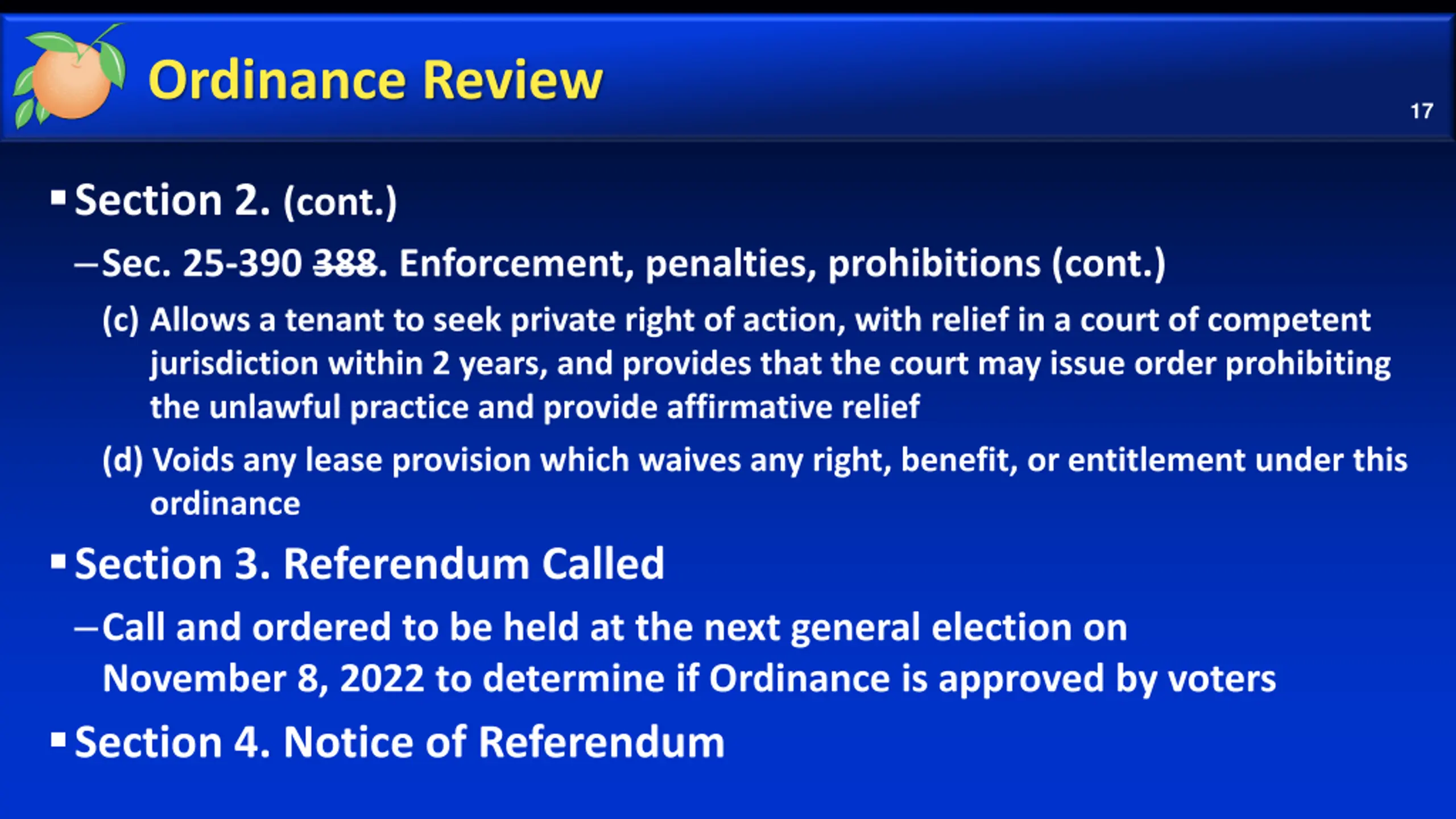 Ordinance Review 17 Section 2. (cont.) Sec. 25-390 388. Enforcement, penalties, prohibitions (cont.) (c) Allows a tenant to seek private right of action, with relief in a court of competent jurisdiction within 2 years, and provides that the court may issue order prohibiting the unlawful practice and provide affirmative relief (d) Voids any lease provision which waives any right, benefit, or entitlement under this ordinance Section 3. Referendum Called Call and ordered to be held at the next general election on November 8, 2022 to determine if Ordinance is approved by voters Section 4. Notice of Referendum