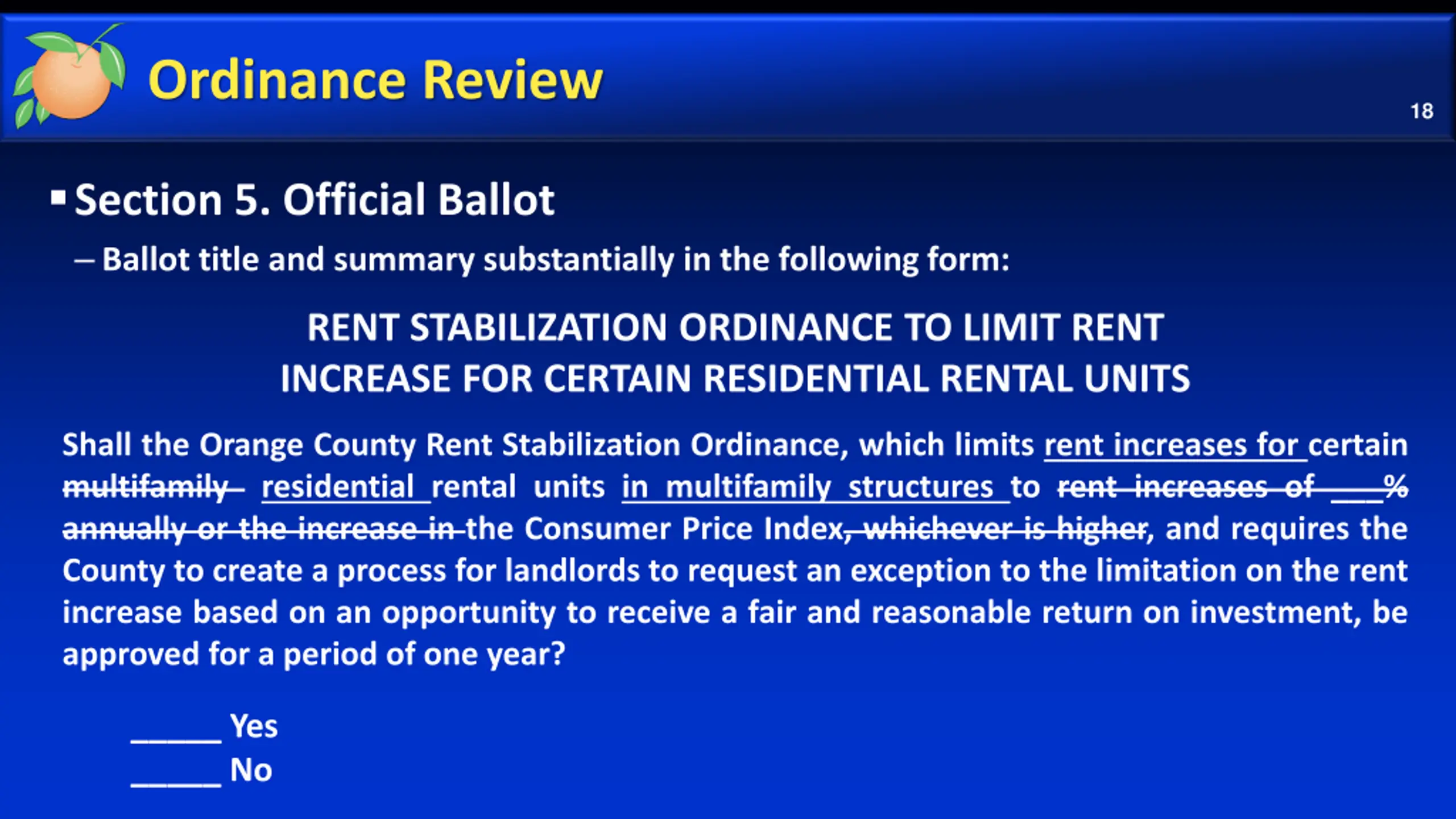 Ordinance Review 18 Section 5. Official Ballot Ballot title and summary substantially in the following form: RENT STABILIZATION ORDINANCE TO LIMIT RENT INCREASE FOR CERTAIN RESIDENTIAL RENTAL UNITS Shall the Orange County Rent Stabilization Ordinance, which limits rent increases for certain multifamily residential rental units in multifamily structures to rent increases of ___% annually or the increase in the Consumer Price Index, whichever is higher, and requires the County to create a process for landlords to request an exception to the limitation on the rent increase based on an opportunity to receive a fair and reasonable return on investment, be approved for a period of one year? _____ Yes _____ No